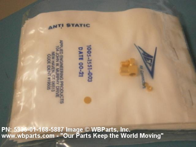 5935-01-168-5887 An electrical fitting with electrical contacts, constructed to be affixed to the end of a cable, conduit, coaxial line, cord or wiring for convenience in joining with other electrical connector(s) or PRINTED WIRING BOARD and is not designed to be mounted on a bulkhead, chasses, panel, PRINTED WIRING BOARD, or the like. Excludes JACK, TELEPHONE; JACK, TIP; PLUG, TELEPHONE; PLUG TIP; INSERT, ELECTRICAL CONNECTOR; CONNECTOR BODY (as modified); and SOCKET, PLUG-IN, ELECTRONIC COMPONENTS. See also LEAD ASSEMBLY, ELECTRICAL; WIRING HARNESS (as modified); and CABLE ASSEMBLY (as modified). For items without inserts, see SHELL, ELECTRICAL CONNECTOR.