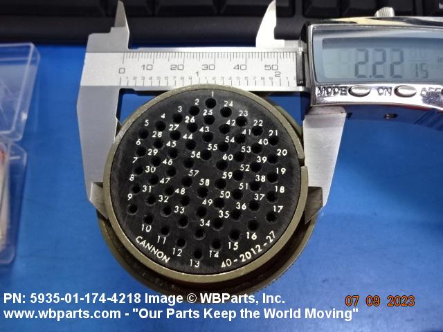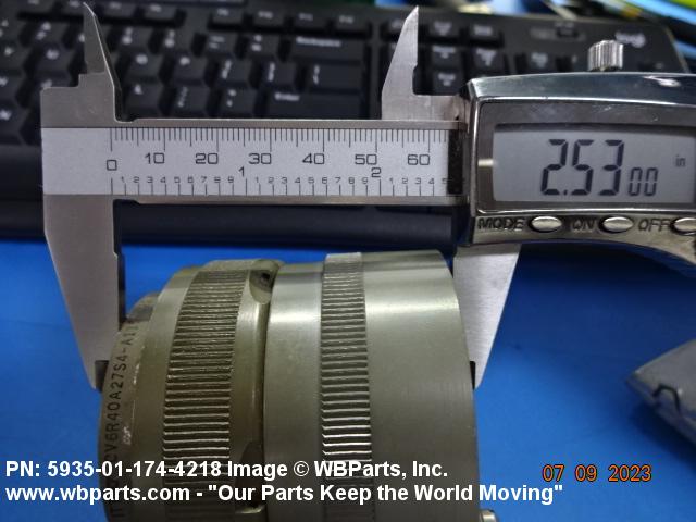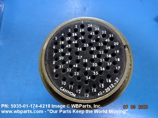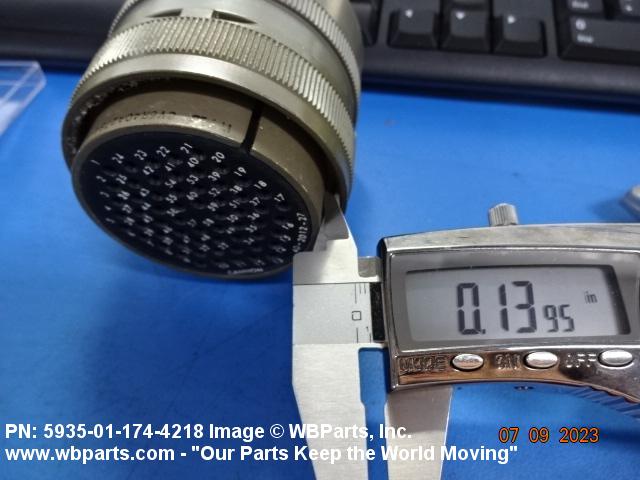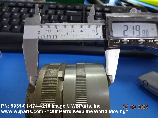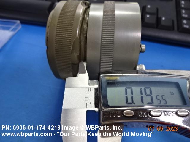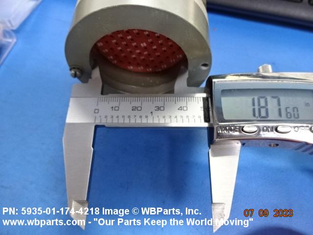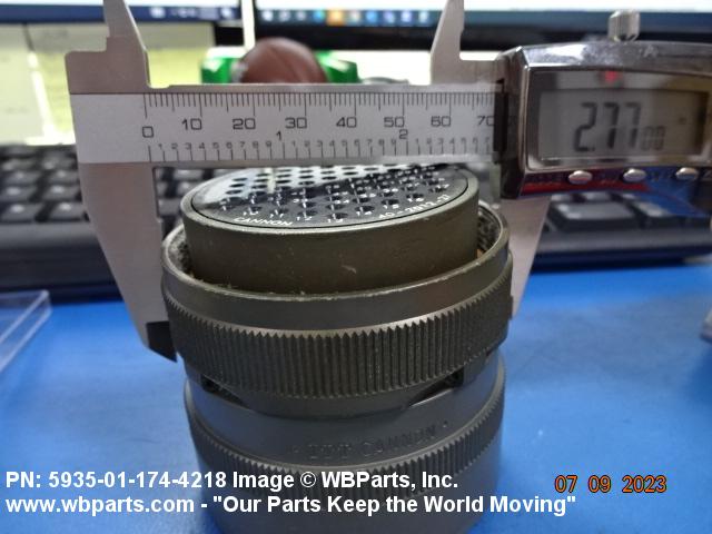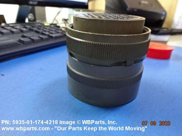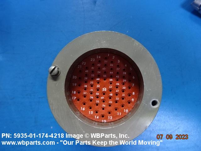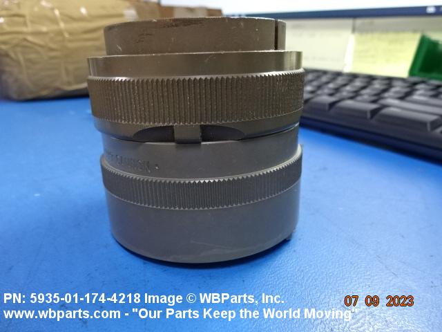 5935-01-174-4218 An electrical fitting with electrical contacts, constructed to be affixed to the end of a cable, conduit, coaxial line, cord or wiring for convenience in joining with other electrical connector(s) or PRINTED WIRING BOARD and is not designed to be mounted on a bulkhead, chasses, panel, PRINTED WIRING BOARD, or the like. Excludes JACK, TELEPHONE; JACK, TIP; PLUG, TELEPHONE; PLUG TIP; INSERT, ELECTRICAL CONNECTOR; CONNECTOR BODY (as modified); and SOCKET, PLUG-IN, ELECTRONIC COMPONENTS. See also LEAD ASSEMBLY, ELECTRICAL; WIRING HARNESS (as modified); and CABLE ASSEMBLY (as modified). For items without inserts, see SHELL, ELECTRICAL CONNECTOR.