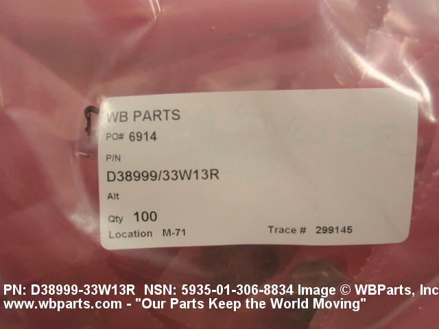 Part Alternates: D38999/33W13R, D3899933W13R, DOD-C-38999/33, DODC3899933, 4331460, 433-1460 , 5935-01-306-8834, 01-306-8834, 5935013068834, 013068834