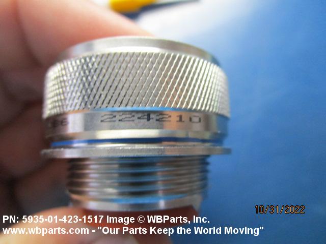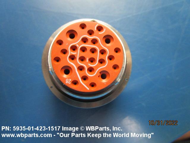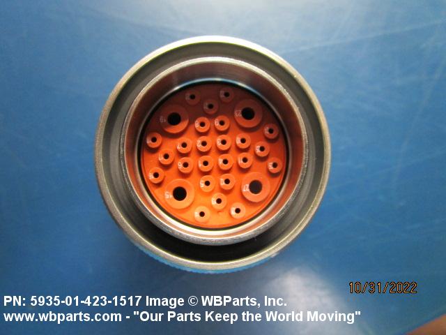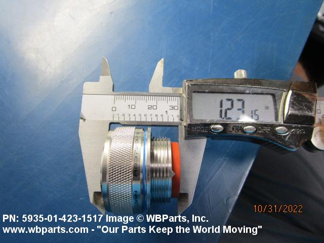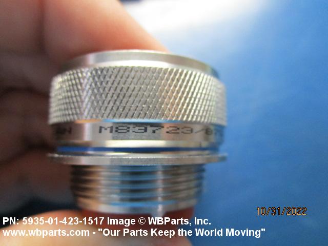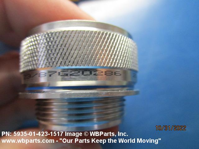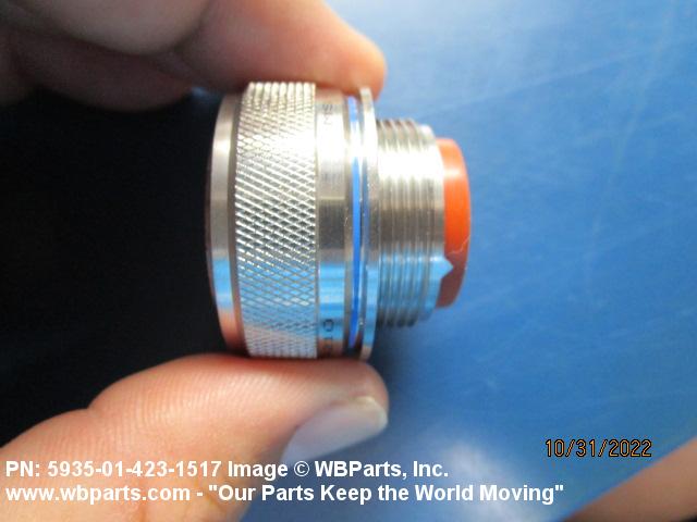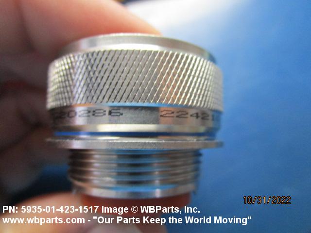 5935-01-423-1517 An electrical fitting with electrical contacts, constructed to be affixed to the end of a cable, conduit, coaxial line, cord or wiring for convenience in joining with other electrical connector(s) or PRINTED WIRING BOARD and is not designed to be mounted on a bulkhead, chasses, panel, PRINTED WIRING BOARD, or the like. Excludes JACK, TELEPHONE; JACK, TIP; PLUG, TELEPHONE; PLUG TIP; INSERT, ELECTRICAL CONNECTOR; CONNECTOR BODY (as modified); and SOCKET, PLUG-IN, ELECTRONIC COMPONENTS. See also LEAD ASSEMBLY, ELECTRICAL; WIRING HARNESS (as modified); and CABLE ASSEMBLY (as modified). For items without inserts, see SHELL, ELECTRICAL CONNECTOR.