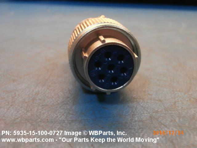5935-15-100-0727 An electrical fitting with electrical contacts, constructed to be affixed to the end of a cable, conduit, coaxial line, cord or wiring for convenience in joining with other electrical connector(s) or PRINTED WIRING BOARD and is not designed to be mounted on a bulkhead, chasses, panel, PRINTED WIRING BOARD, or the like. Excludes JACK, TELEPHONE; JACK, TIP; PLUG, TELEPHONE; PLUG TIP; INSERT, ELECTRICAL CONNECTOR; CONNECTOR BODY (as modified); and SOCKET, PLUG-IN, ELECTRONIC COMPONENTS. See also LEAD ASSEMBLY, ELECTRICAL; WIRING HARNESS (as modified); and CABLE ASSEMBLY (as modified). For items without inserts, see SHELL, ELECTRICAL CONNECTOR.