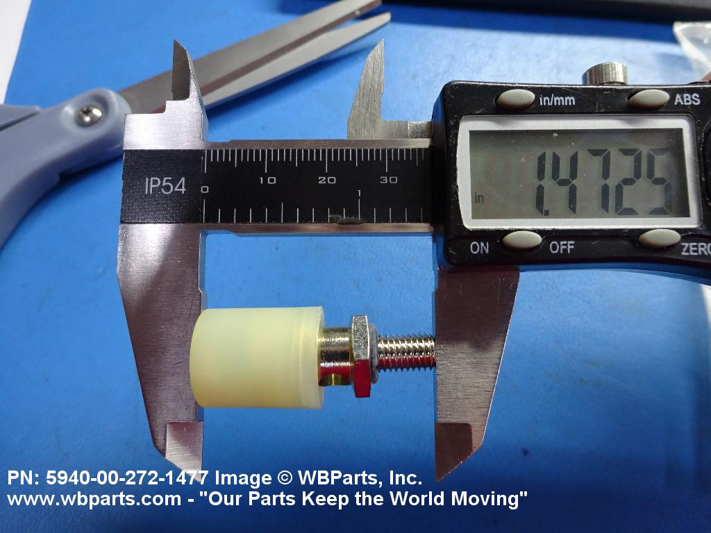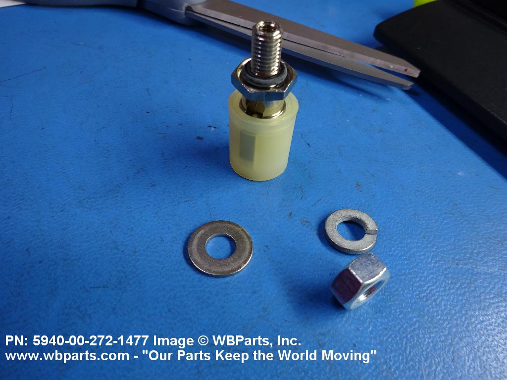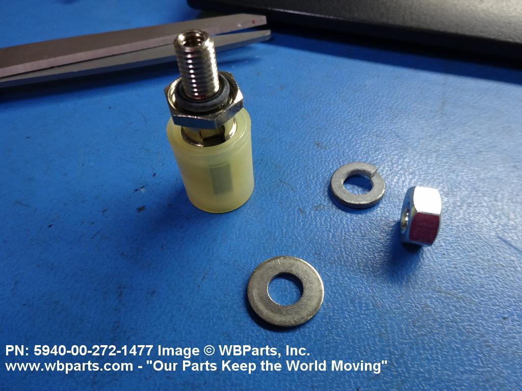 5940-00-272-1477 A metallic postlike terminal, insulated or uninsulated, which is mounted on a board, chassis, panel, or other similar supporting surface. It is designed for frequent manual connections and disconnections of at least one electrical conductor, such as a wire, alligator clip, or spade lug. It may have additional tip jack features for the acceptance of banana plugs, phone tips, and the like. It may also have provisions for permanently attaching an electrical conductor(s). For items which require all electrical conductors to be permanently attached (soldered, crimped, and the like), see TERMINAL, STUD. See also JACK, TIP.