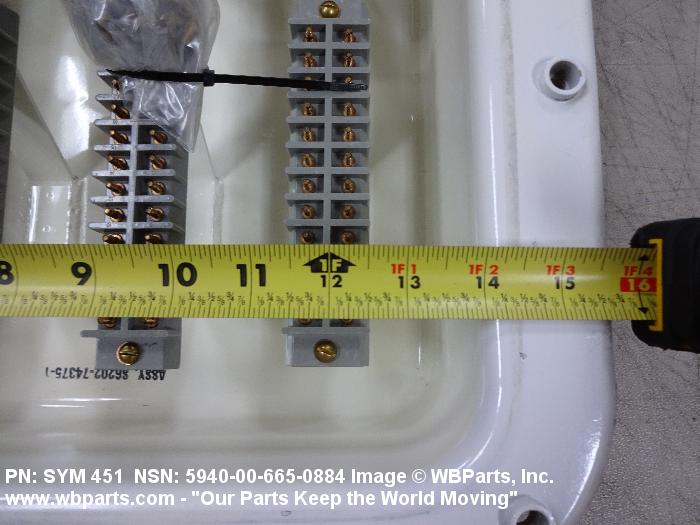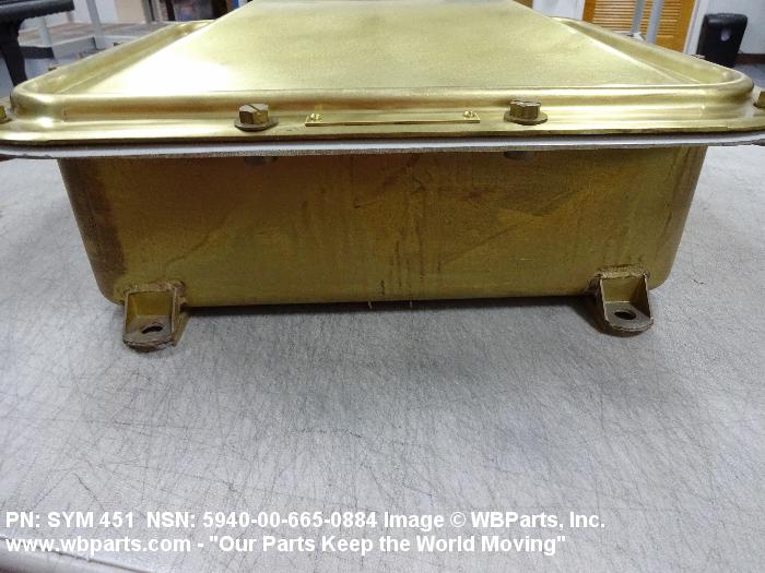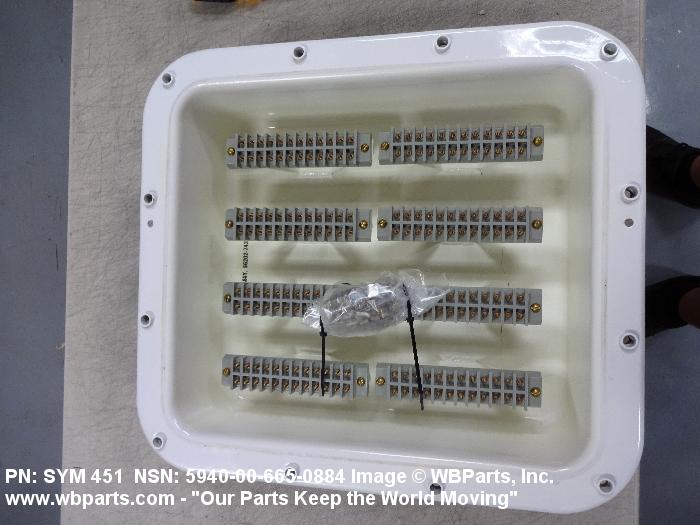 5940-00-665-0884 An enclosure which includes, mounts and protects one or more terminals and/or terminal boards. It is designed for and may include a cover and such accessories as mounting hardware, brackets, locks, and conduit fittings. For boxes which include combinations of different electrical devices such as terminals and/or terminal boards, fuseholders, switches, jacks, circuit breakers, connectors and the like, see DISTRIBUTION BOX. For boxes which are designed to mount, but which do not include terminals and/or terminal boards, see JUNCTION BOX. Excludes TERMINAL BOARD ASSEMBLY. See also CHAMBER, CABLE TERMINAL; and INTERCONNECTING CABINET.