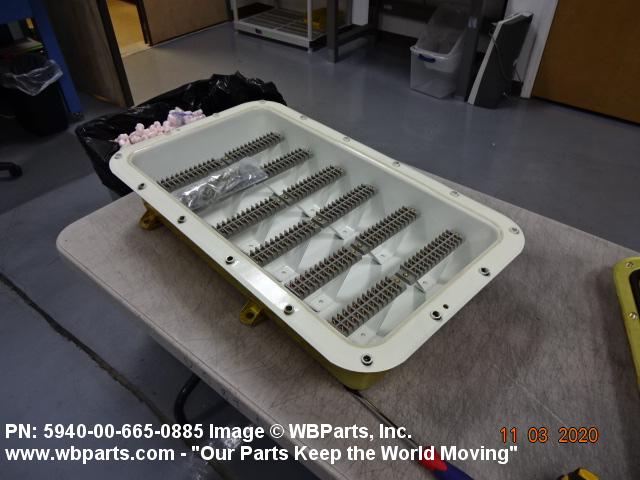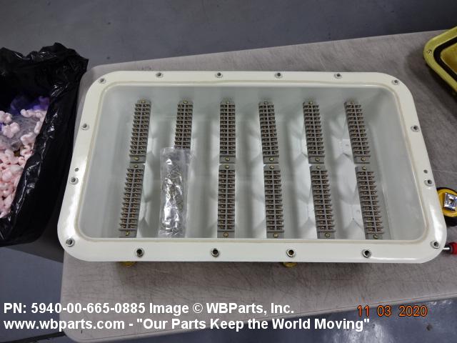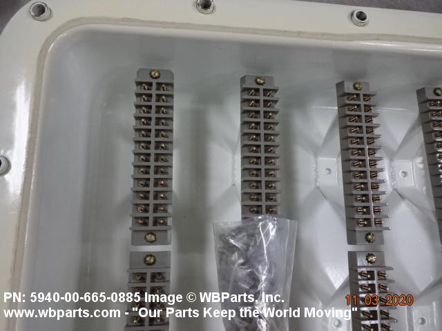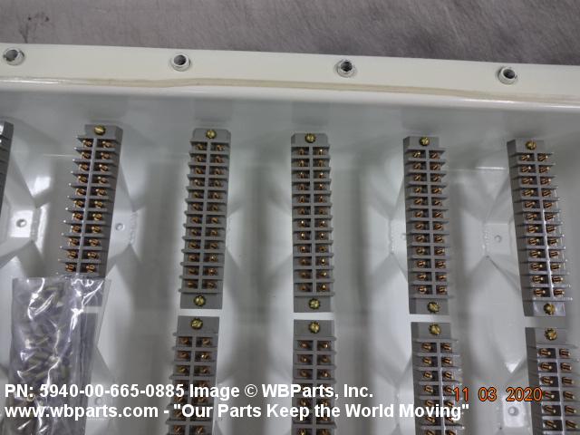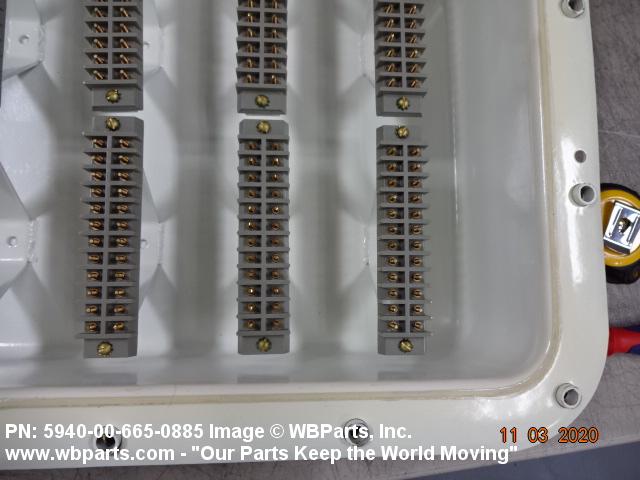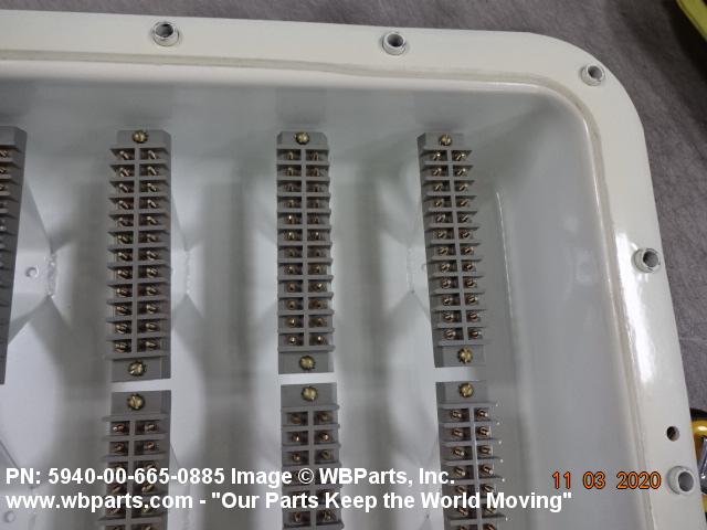 5940-00-665-0885 An enclosure which includes, mounts and protects one or more terminals and/or terminal boards. It is designed for and may include a cover and such accessories as mounting hardware, brackets, locks, and conduit fittings. For boxes which include combinations of different electrical devices such as terminals and/or terminal boards, fuseholders, switches, jacks, circuit breakers, connectors and the like, see DISTRIBUTION BOX. For boxes which are designed to mount, but which do not include terminals and/or terminal boards, see JUNCTION BOX. Excludes TERMINAL BOARD ASSEMBLY. See also CHAMBER, CABLE TERMINAL; and INTERCONNECTING CABINET.