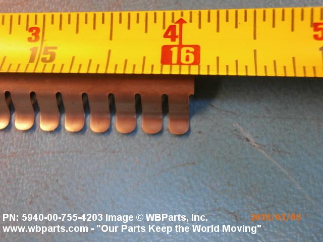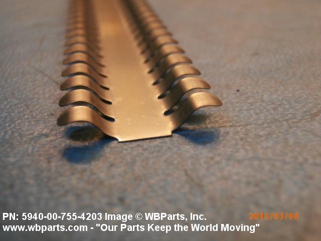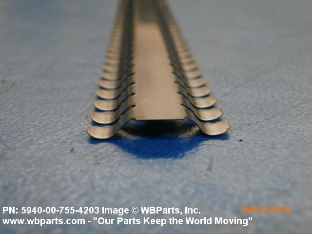 5940-00-755-4203 A semirigid metallic item of electrically conductive material designed for the specific purpose of grounding and/or bonding radio frequency equipment. It is normally attached to one item to give spring action to form a ground and/or bond with another item. Excludes TERMINAL STRIP, GROUNDING; CONTACT, ELECTRICAL; and STRIP, ELECTRICAL GROUNDING.