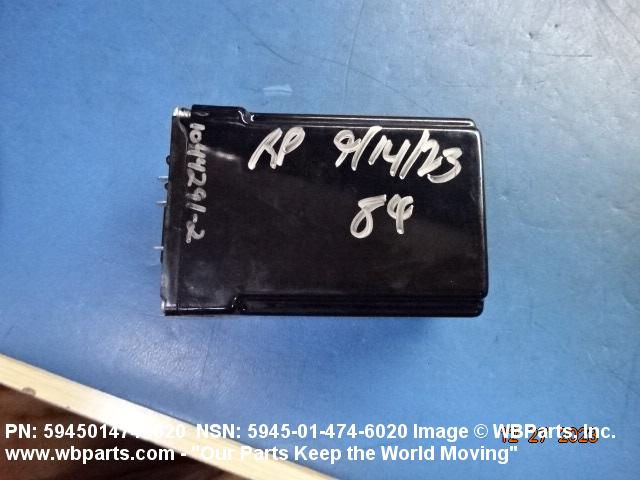 5945-01-474-6020 A relay which is actuated by the effect of a magnetic field developed by the current in its energizing coil(s). Includes solenoid and armature types. Excludes CONTACTOR, MAGNETIC; RELAY, METER MOVEMENT; RELAY, MOTOR DRIVEN; RELAY, REED; RELAY, RESONANT REED; RELAY, ROTARY; and SWITCH, STEPPING.