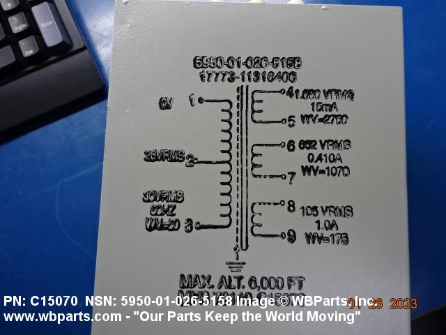 5950-01-026-5158 A transformer consisting of one or more primary winding(s) and one or more secondary winding(s). It may be designed for direct connection to an alternating current source for purposes of changing the secondary volts and amperes or designed to eliminate metallic interconnection between circuits in an overall one to one voltage ratio, with or without additional output windings, or items designed to automatically maintain a constant output voltage within specified limits under varying input or load conditions. Also includes items having a provision for mechanically changing the turns ratio or inductive coupling in progressive increments by means of voltage taps, ratio adjuster, or devices oe similar design. For transformers having winding(s) common to both input and output circuits, see TRANSFORMER (1), POWER, AUTOTRANSFORMER. Excludes TRANSFORMER (1), PULSE.20259500022Coils and Transformers61200044Transformers: Distribution and Power Station