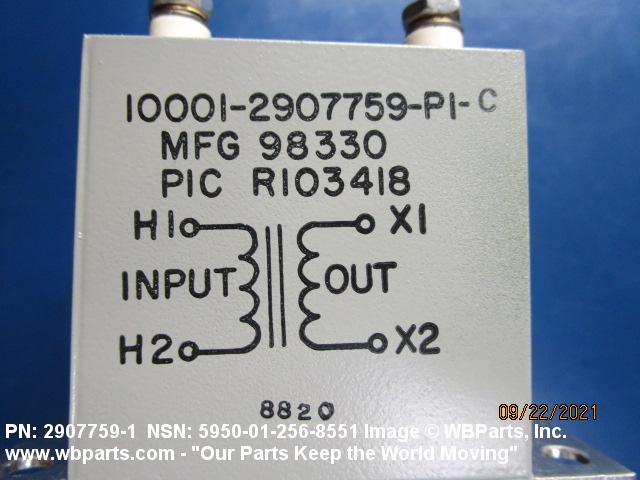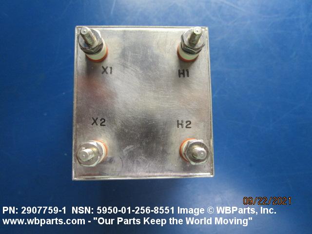 5950-01-256-8551 A transformer consisting of one or more primary winding(s) and one or more secondary winding(s). It may be designed for direct connection to an alternating current source for purposes of changing the secondary volts and amperes or designed to eliminate metallic interconnection between circuits in an overall one to one voltage ratio, with or without additional output windings, or items designed to automatically maintain a constant output voltage within specified limits under varying input or load conditions. Also includes items having a provision for mechanically changing the turns ratio or inductive coupling in progressive increments by means of voltage taps, ratio adjuster, or devices oe similar design. For transformers having winding(s) common to both input and output circuits, see TRANSFORMER (1), POWER, AUTOTRANSFORMER. Excludes TRANSFORMER (1), PULSE.20259500022Coils and Transformers61200044Transformers: Distribution and Power Station