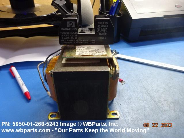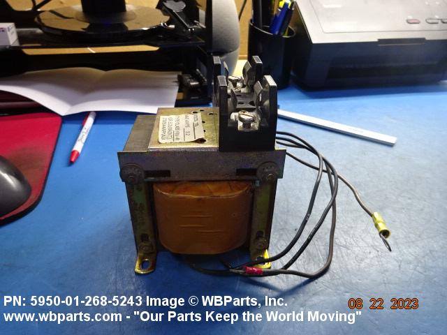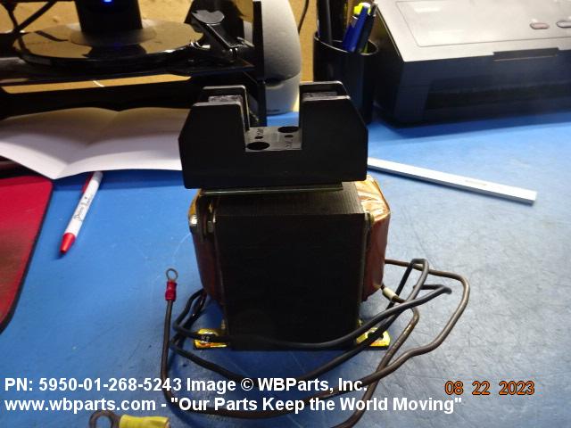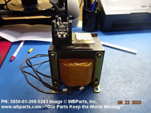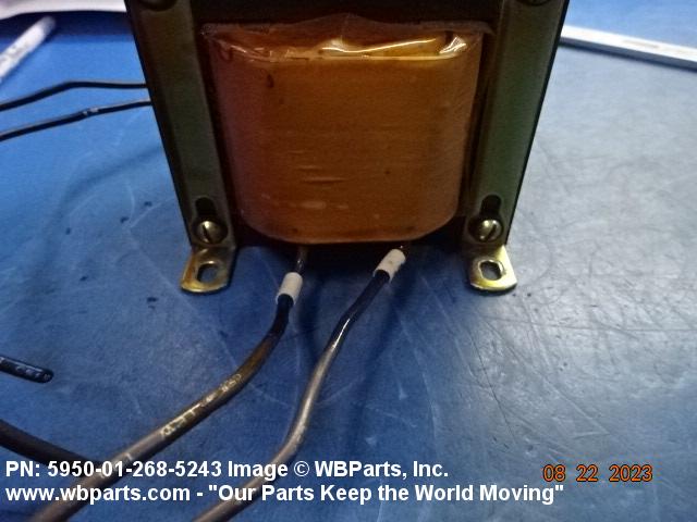 5950-01-268-5243 A transformer consisting of one or more primary winding(s) and one or more secondary winding(s). It may be designed for direct connection to an alternating current source for purposes of changing the secondary volts and amperes or designed to eliminate metallic interconnection between circuits in an overall one to one voltage ratio, with or without additional output windings, or items designed to automatically maintain a constant output voltage within specified limits under varying input or load conditions. Also includes items having a provision for mechanically changing the turns ratio or inductive coupling in progressive increments by means of voltage taps, ratio adjuster, or devices oe similar design. For transformers having winding(s) common to both input and output circuits, see TRANSFORMER (1), POWER, AUTOTRANSFORMER. Excludes TRANSFORMER (1), PULSE.20259500022Coils and Transformers61200044Transformers: Distribution and Power Station