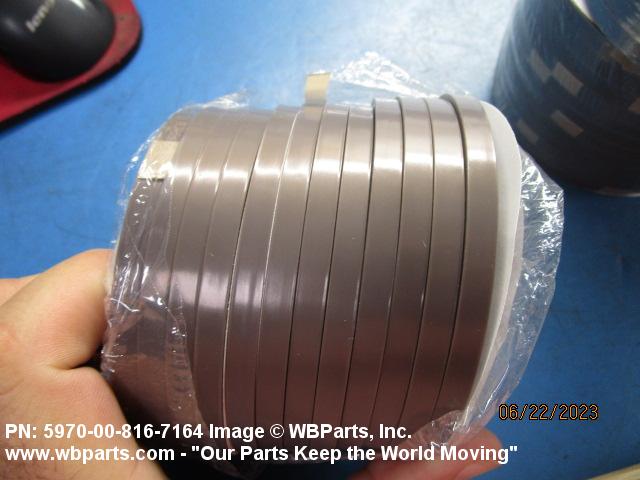 5970-00-816-7164 A narrow strip of woven or processed material less than twelve inches (304.8 mm) in width. It is specifically designed to prevent any undesirable flow of current between conductors and other objects. The item tends to resist any physical change, in contrast to an insulating compound in tape form which will fuse under a specified heat or pressure. It may or may not have adhesive backing. Excludes items not having definite rated electrical characteristics, such as TAPE, ADHESIVE, RUBBER; TAPE, PRESSURE SENSITIVE ADHESIVE; TAPE, SEMI-CONDUCTING, ELECTRICAL; and TAPE, SHIELDING, ELECTRICAL. See also INSULATION CLOTH, ELECTRICAL and INSULATING COMPOUND, ELECTRICAL.
