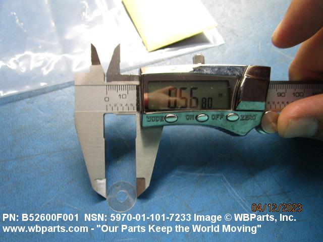5970-01-101-7233 An insulator that is essentially thin and flat, with one through hole centrally located. The general shape may vary by the addition of features such as beveled edges, indented surfaces, through hole keys, and/or peripheral flats. The thickness measured between the two parallel bearing surfaces must not exceed 25 percent of the outside diameter or the shortest distance between peripheral flats. The thickness measured between the two parallel bearing surfaces must not exceed 25 percent of the outside diameter or the shortest distance between peripheral flats. Excludes items with more than one hole. See also INSULATOR, DISK; INSULATOR, BEAD; INSULATOR, BUSHING; and INSULATOR, PLATE