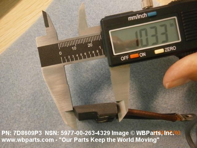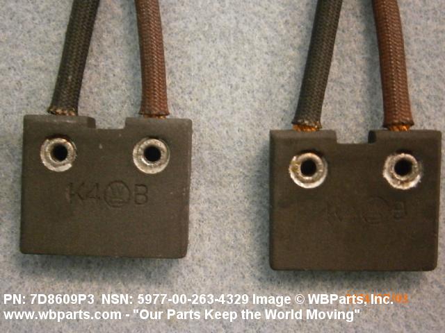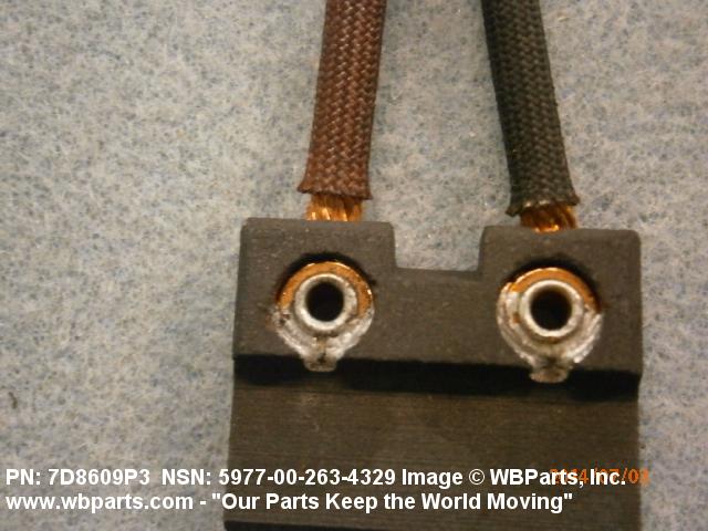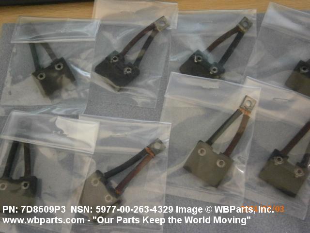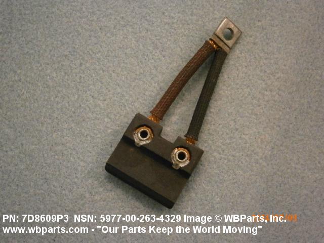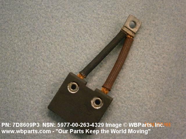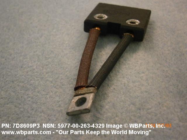 5977-00-263-4329 An item specifically designed to be used in the transfer of electrical energy to or from another conducting surface. Either the brush or the surface is continually moving during the transfer of energy. The brush is usually composed in part of some form of the element carbon. Includes: (1) a single brush either with or without an attached shunt (flexible wire lead) and/or a helical or flat type pressure spring; (2) a split brush composed of two or more pieces (wafers), which are used in place of one brush usually connected together by individual shunts to a common terminal; (3) paired brushes composed of two identical or non-identical brushes connected together by a common shunt either with or without pressure springs or connected by individual shunts to a common terminal, or with pressure springs and connected to a common bar, bracket or the like either with or without individual shunts; (4) multiple brushes composed of more than two identical or non-identical brushes without pressure springs connected by individual shunts to a common terminal, or with pressure springs and connected to a common bar, bracket or the like by individual shunts. Does not include moving contacts which make and slide past stationary contacts, but are stationary while the circuit is conducting, such as the sliding contacts on a rheostat or the stationary contact on a synchro. Excludes: CONTACT, ELECTRICAL; and CONTACT ASSEMBLY, ELECTRICAL.