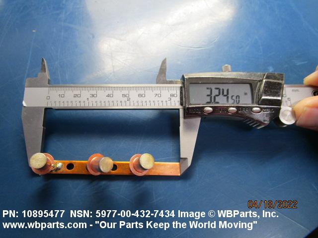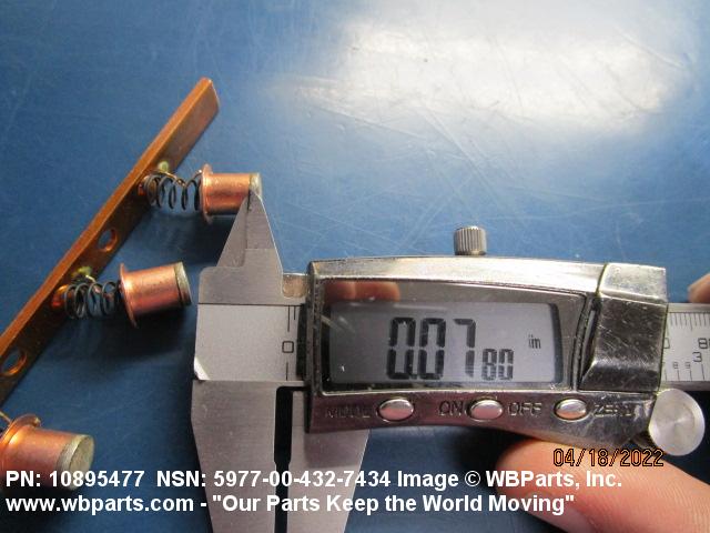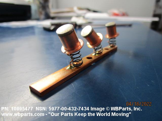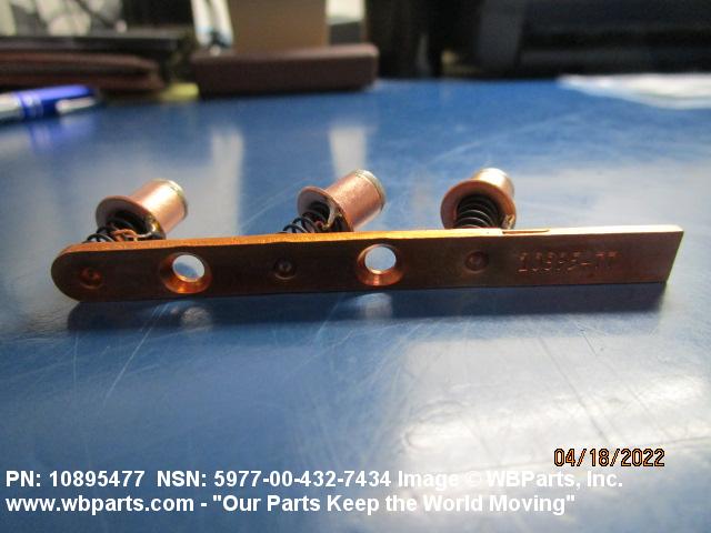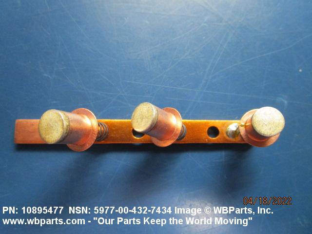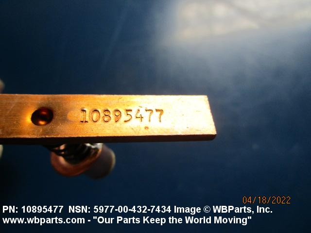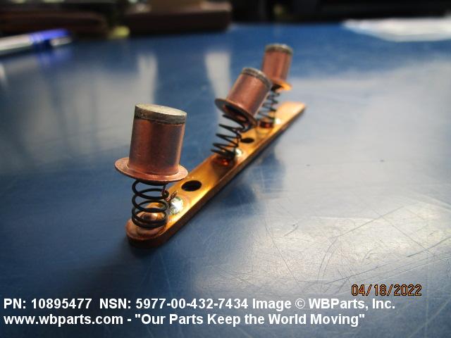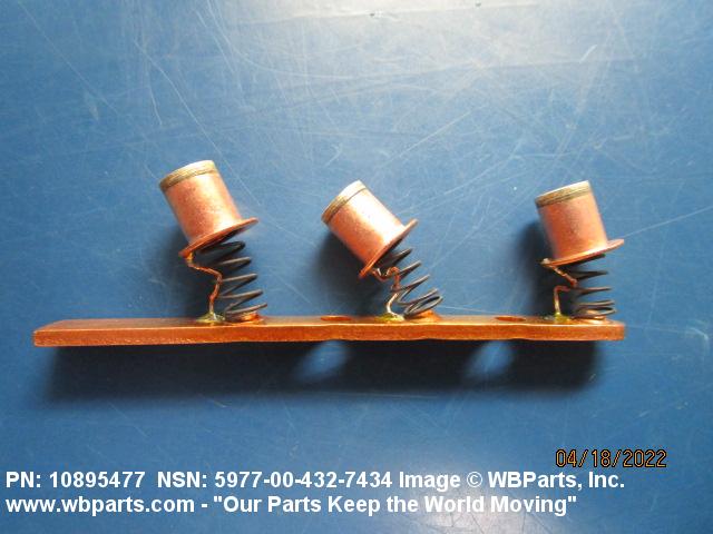 5977-00-432-7434 An item specifically designed to be used in the transfer of electrical energy to or from another conducting surface. Either the brush or the surface is continually moving during the transfer of energy. The brush is usually composed in part of some form of the element carbon. Includes: (1) a single brush either with or without an attached shunt (flexible wire lead) and/or a helical or flat type pressure spring; (2) a split brush composed of two or more pieces (wafers), which are used in place of one brush usually connected together by individual shunts to a common terminal; (3) paired brushes composed of two identical or non-identical brushes connected together by a common shunt either with or without pressure springs or connected by individual shunts to a common terminal, or with pressure springs and connected to a common bar, bracket or the like either with or without individual shunts; (4) multiple brushes composed of more than two identical or non-identical brushes without pressure springs connected by individual shunts to a common terminal, or with pressure springs and connected to a common bar, bracket or the like by individual shunts. Does not include moving contacts which make and slide past stationary contacts, but are stationary while the circuit is conducting, such as the sliding contacts on a rheostat or the stationary contact on a synchro. Excludes: CONTACT, ELECTRICAL; and CONTACT ASSEMBLY, ELECTRICAL.