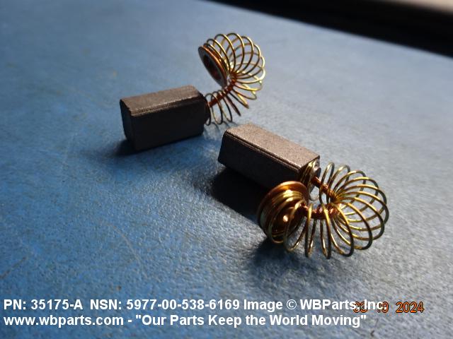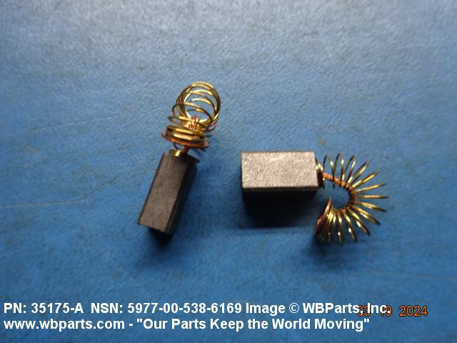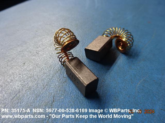 5977-00-538-6169 An item specifically designed to be used in the transfer of electrical energy to or from another conducting surface. Either the brush or the surface is continually moving during the transfer of energy. The brush is usually composed in part of some form of the element carbon. Includes: (1) a single brush either with or without an attached shunt (flexible wire lead) and/or a helical or flat type pressure spring; (2) a split brush composed of two or more pieces (wafers), which are used in place of one brush usually connected together by individual shunts to a common terminal; (3) paired brushes composed of two identical or non-identical brushes connected together by a common shunt either with or without pressure springs or connected by individual shunts to a common terminal, or with pressure springs and connected to a common bar, bracket or the like either with or without individual shunts; (4) multiple brushes composed of more than two identical or non-identical brushes without pressure springs connected by individual shunts to a common terminal, or with pressure springs and connected to a common bar, bracket or the like by individual shunts. Does not include moving contacts which make and slide past stationary contacts, but are stationary while the circuit is conducting, such as the sliding contacts on a rheostat or the stationary contact on a synchro. Excludes: CONTACT, ELECTRICAL; and CONTACT ASSEMBLY, ELECTRICAL.