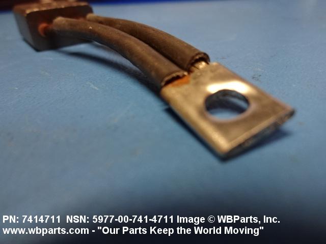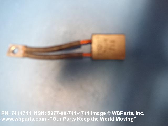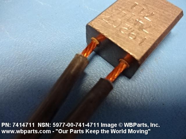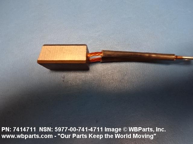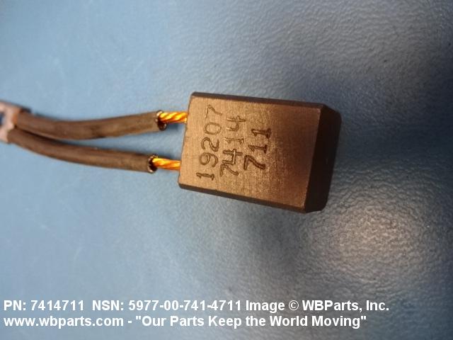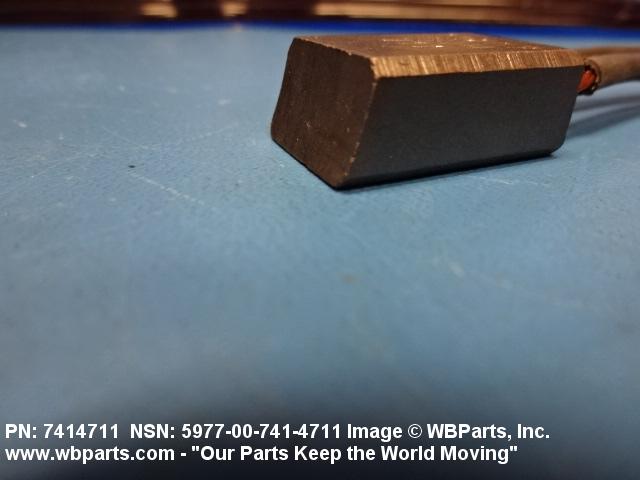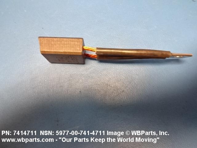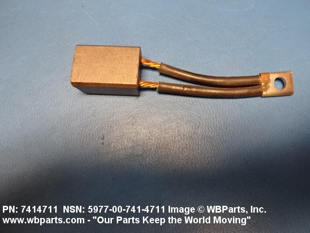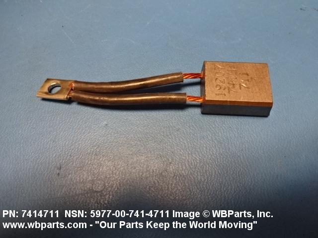 5977-00-741-4711 An item specifically designed to be used in the transfer of electrical energy to or from another conducting surface. Either the brush or the surface is continually moving during the transfer of energy. The brush is usually composed in part of some form of the element carbon. Includes: (1) a single brush either with or without an attached shunt (flexible wire lead) and/or a helical or flat type pressure spring; (2) a split brush composed of two or more pieces (wafers), which are used in place of one brush usually connected together by individual shunts to a common terminal; (3) paired brushes composed of two identical or non-identical brushes connected together by a common shunt either with or without pressure springs or connected by individual shunts to a common terminal, or with pressure springs and connected to a common bar, bracket or the like either with or without individual shunts; (4) multiple brushes composed of more than two identical or non-identical brushes without pressure springs connected by individual shunts to a common terminal, or with pressure springs and connected to a common bar, bracket or the like by individual shunts. Does not include moving contacts which make and slide past stationary contacts, but are stationary while the circuit is conducting, such as the sliding contacts on a rheostat or the stationary contact on a synchro. Excludes: CONTACT, ELECTRICAL; and CONTACT ASSEMBLY, ELECTRICAL.