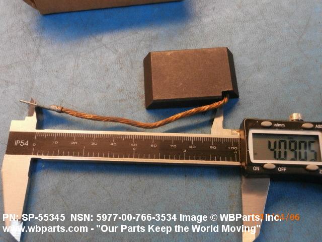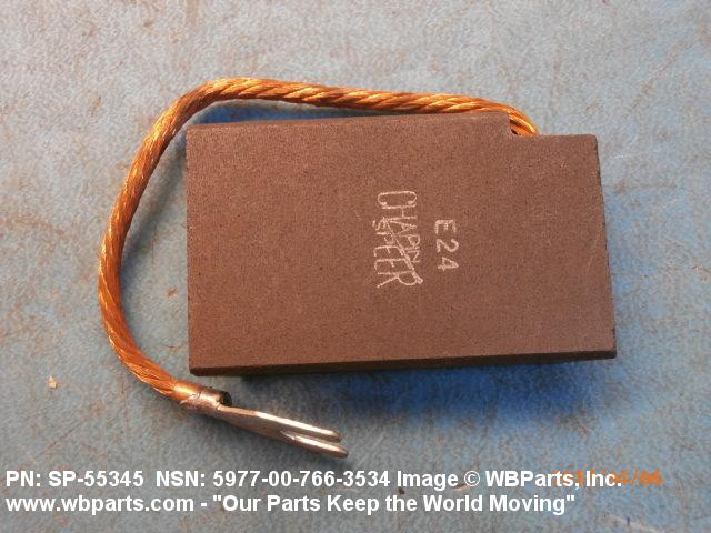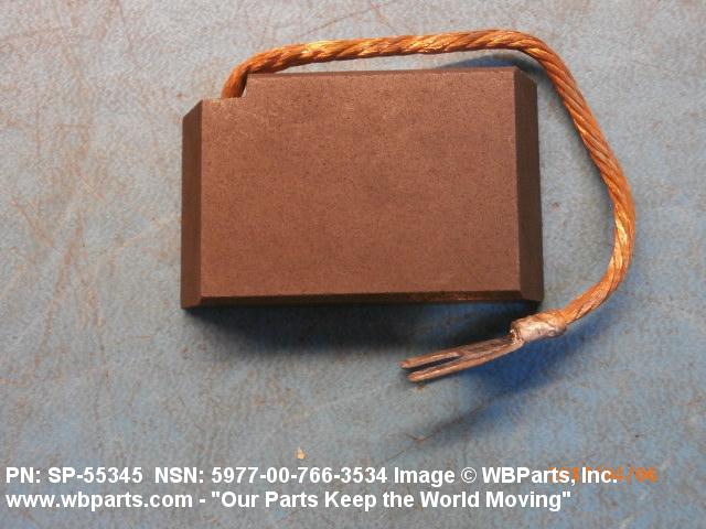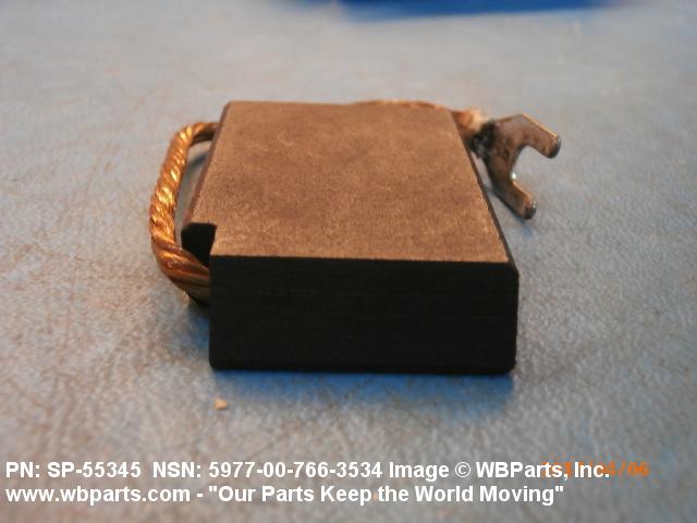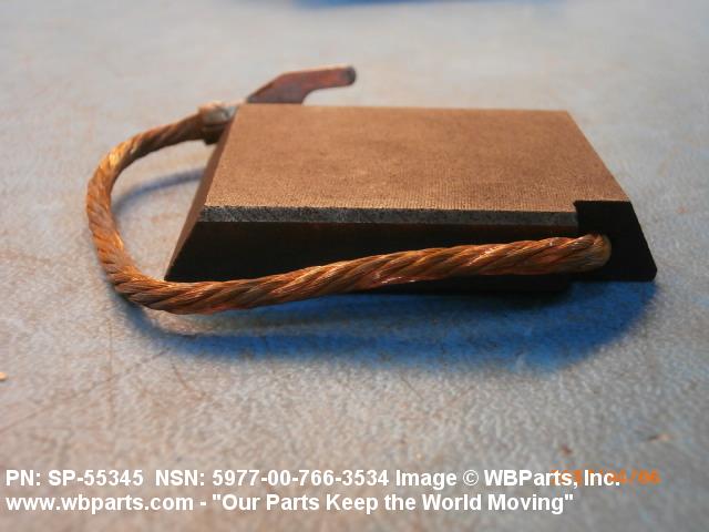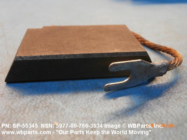 5977-00-766-3534 An item specifically designed to be used in the transfer of electrical energy to or from another conducting surface. Either the brush or the surface is continually moving during the transfer of energy. The brush is usually composed in part of some form of the element carbon. Includes: (1) a single brush either with or without an attached shunt (flexible wire lead) and/or a helical or flat type pressure spring; (2) a split brush composed of two or more pieces (wafers), which are used in place of one brush usually connected together by individual shunts to a common terminal; (3) paired brushes composed of two identical or non-identical brushes connected together by a common shunt either with or without pressure springs or connected by individual shunts to a common terminal, or with pressure springs and connected to a common bar, bracket or the like either with or without individual shunts; (4) multiple brushes composed of more than two identical or non-identical brushes without pressure springs connected by individual shunts to a common terminal, or with pressure springs and connected to a common bar, bracket or the like by individual shunts. Does not include moving contacts which make and slide past stationary contacts, but are stationary while the circuit is conducting, such as the sliding contacts on a rheostat or the stationary contact on a synchro. Excludes: CONTACT, ELECTRICAL; and CONTACT ASSEMBLY, ELECTRICAL.
