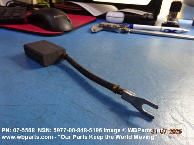 5977-00-848-5196 An item specifically designed to be used in the transfer of electrical energy to or from another conducting surface. Either the brush or the surface is continually moving during the transfer of energy. The brush is usually composed in part of some form of the element carbon. Includes: (1) a single brush either with or without an attached shunt (flexible wire lead) and/or a helical or flat type pressure spring; (2) a split brush composed of two or more pieces (wafers), which are used in place of one brush usually connected together by individual shunts to a common terminal; (3) paired brushes composed of two identical or non-identical brushes connected together by a common shunt either with or without pressure springs or connected by individual shunts to a common terminal, or with pressure springs and connected to a common bar, bracket or the like either with or without individual shunts; (4) multiple brushes composed of more than two identical or non-identical brushes without pressure springs connected by individual shunts to a common terminal, or with pressure springs and connected to a common bar, bracket or the like by individual shunts. Does not include moving contacts which make and slide past stationary contacts, but are stationary while the circuit is conducting, such as the sliding contacts on a rheostat or the stationary contact on a synchro. Excludes: CONTACT, ELECTRICAL; and CONTACT ASSEMBLY, ELECTRICAL.