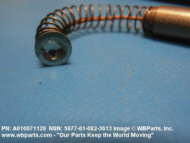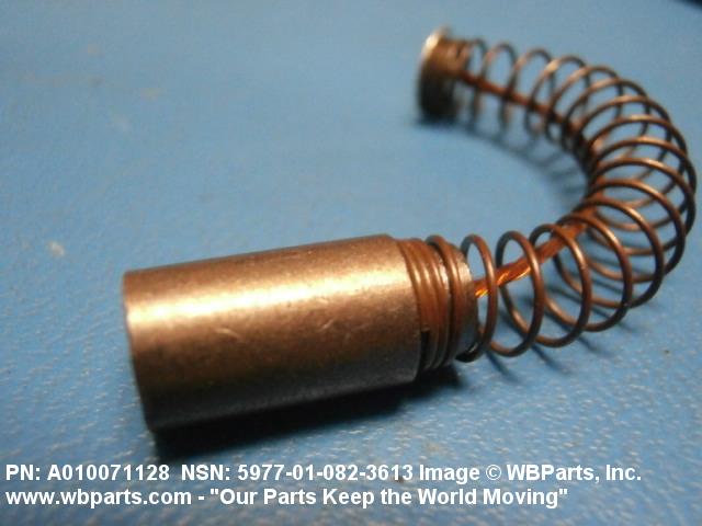 5977-01-082-3613 An item specifically designed to be used in the transfer of electrical energy to or from another conducting surface. Either the brush or the surface is continually moving during the transfer of energy. The brush is usually composed in part of some form of the element carbon. Includes: (1) a single brush either with or without an attached shunt (flexible wire lead) and/or a helical or flat type pressure spring; (2) a split brush composed of two or more pieces (wafers), which are used in place of one brush usually connected together by individual shunts to a common terminal; (3) paired brushes composed of two identical or non-identical brushes connected together by a common shunt either with or without pressure springs or connected by individual shunts to a common terminal, or with pressure springs and connected to a common bar, bracket or the like either with or without individual shunts; (4) multiple brushes composed of more than two identical or non-identical brushes without pressure springs connected by individual shunts to a common terminal, or with pressure springs and connected to a common bar, bracket or the like by individual shunts. Does not include moving contacts which make and slide past stationary contacts, but are stationary while the circuit is conducting, such as the sliding contacts on a rheostat or the stationary contact on a synchro. Excludes: CONTACT, ELECTRICAL; and CONTACT ASSEMBLY, ELECTRICAL.