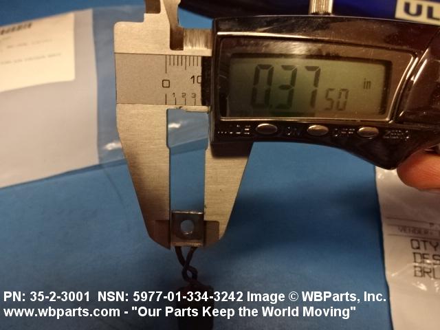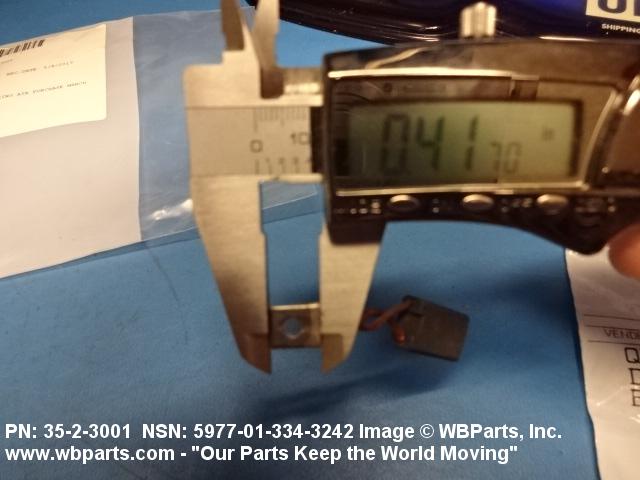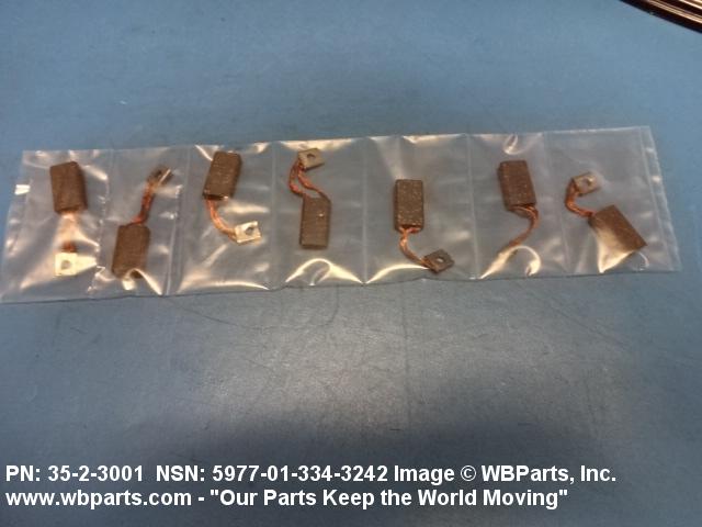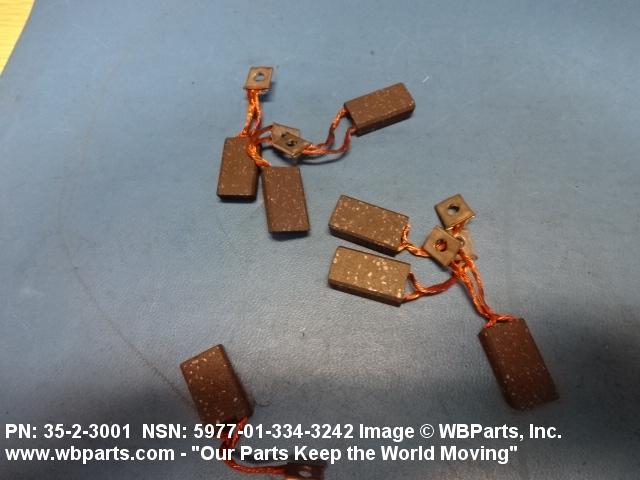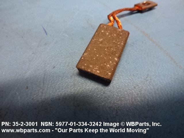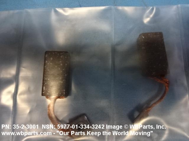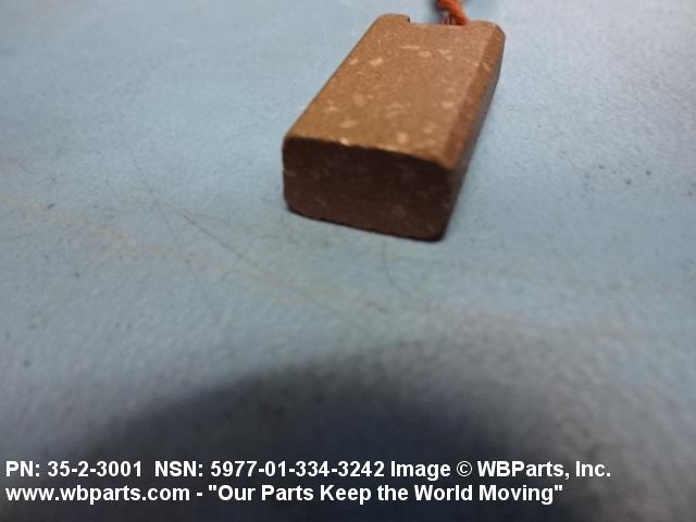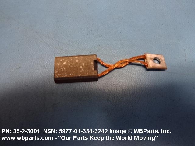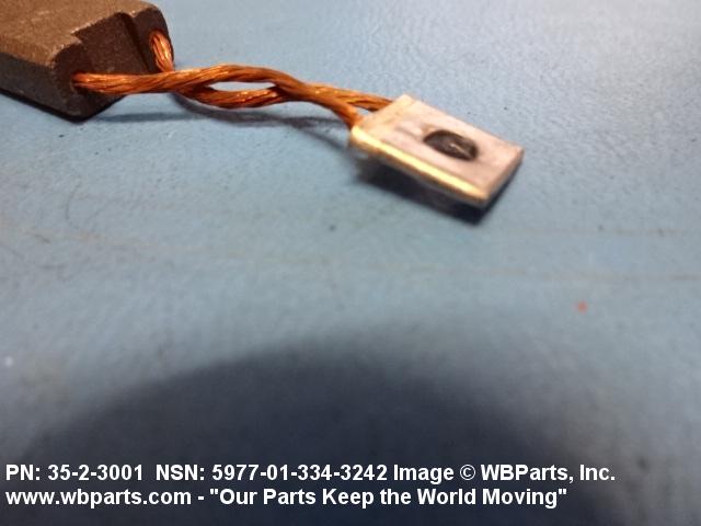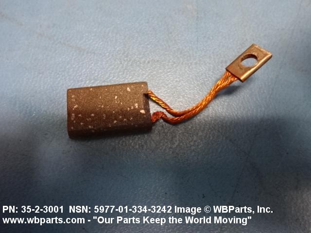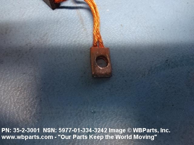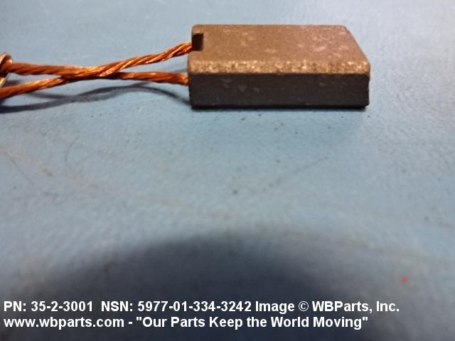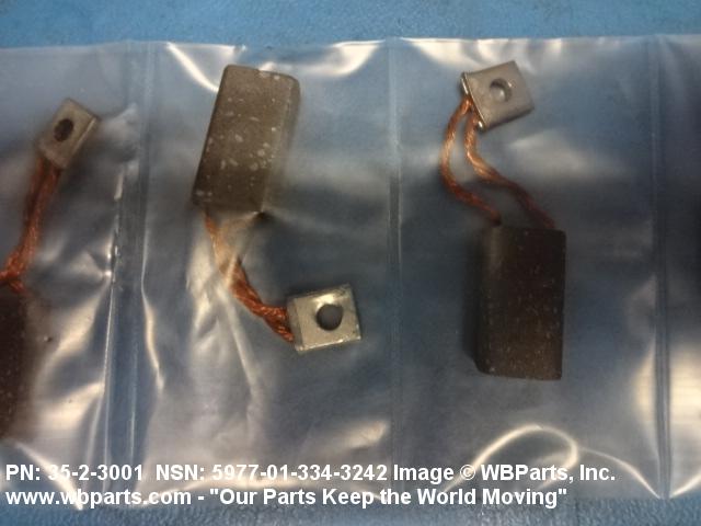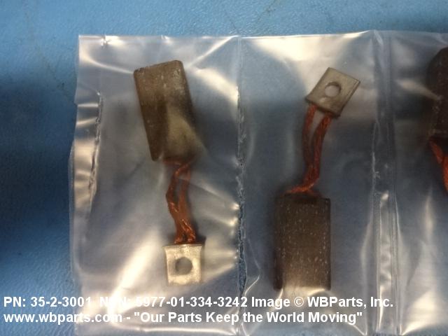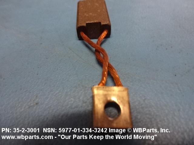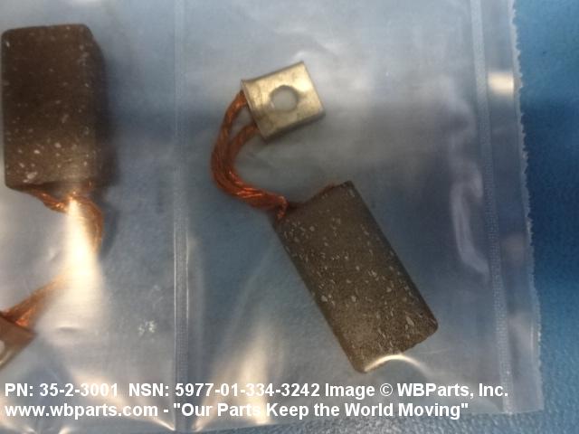 5977-01-334-3242 An item specifically designed to be used in the transfer of electrical energy to or from another conducting surface. Either the brush or the surface is continually moving during the transfer of energy. The brush is usually composed in part of some form of the element carbon. Includes: (1) a single brush either with or without an attached shunt (flexible wire lead) and/or a helical or flat type pressure spring; (2) a split brush composed of two or more pieces (wafers), which are used in place of one brush usually connected together by individual shunts to a common terminal; (3) paired brushes composed of two identical or non-identical brushes connected together by a common shunt either with or without pressure springs or connected by individual shunts to a common terminal, or with pressure springs and connected to a common bar, bracket or the like either with or without individual shunts; (4) multiple brushes composed of more than two identical or non-identical brushes without pressure springs connected by individual shunts to a common terminal, or with pressure springs and connected to a common bar, bracket or the like by individual shunts. Does not include moving contacts which make and slide past stationary contacts, but are stationary while the circuit is conducting, such as the sliding contacts on a rheostat or the stationary contact on a synchro. Excludes: CONTACT, ELECTRICAL; and CONTACT ASSEMBLY, ELECTRICAL.