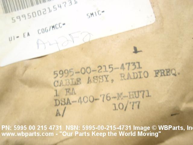 5995-00-215-4731 A definite continuous length of CABLE, SPECIAL PURPOSE, ELECTRICAL, having one or more ends processed or terminated in fittings which provide for connection to other items. Excludes items having branches or forks. Excludes LEAD, TEST and CABLE AND CONDUIT ASSEMBLY, ELECTRICAL.20611350043Fuzing and Firing Devices, Nuclear Ordnance11900057Specialized Test and Handling Equipment, Nuclear Ordnance132500004935000059950057Cable, Cord, and Wire Assemblies: Communication Equipment61500055Miscellaneous Electric Power and Distribution Equipment