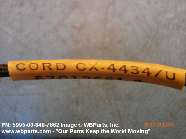 5995-00-848-7662 A definite length of CORD, ELECTRICAL having one or both ends processed and/or terminated in fittings which provide for connection to another item. It is generally used with telephone and communication equipment, such as headsets, category cable and switchboard patch cable. See also CABLE ASSEMBLY, (as modified and LEAD (as modified.