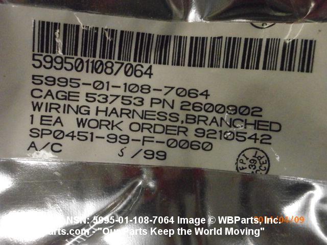 5995-01-108-7064 An item conforming to the definition of WIRING HARNESS with branches (forks). See also CABLE ASSEMBLY, SPECIAL PURPOSE, ELECTRICAL, BRANCHED, Excludes LEAD ASSEMBLY, ELECTRICAL; and LEAD, TEST.20711050013Nuclear Bombs11150037Nuclear Warheads and Warhead Sections11350043Fuzing and Firing Devices, Nuclear Ordnance11900057Specialized Test and Handling Equipment, Nuclear Ordnance25900034Miscellaneous Vehicular Components59950057Cable, Cord, and Wire Assemblies: Communication Equipment61500055Miscellaneous Electric Power and Distribution Equipment
