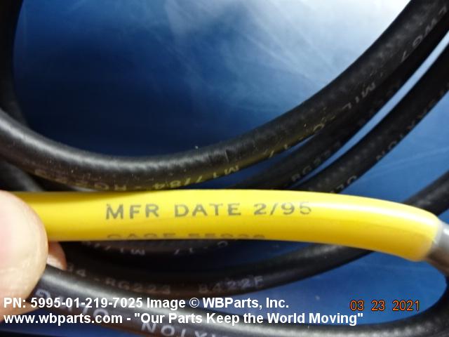 5995-01-219-7025 A definite length of CABLE, RADIO FREQUENCY having one or both ends processed and/or terminated in fittings which provide for connection to other items. Includes multiple cable assemblies in a common jacket or shield. Excludes items having branches or forks and LEAD, TEST. See also CABLE ASSEMBLY, RADIO FREQUENCY, BRANCHED.20211350043Fuzing and Firing Devices, Nuclear Ordnance59950057Cable, Cord, and Wire Assemblies: Communication Equipment