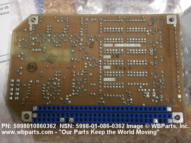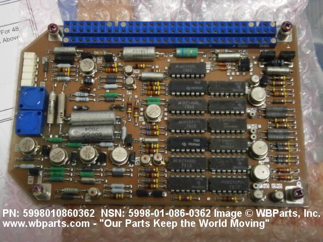 5998-01-086-0362 A grouping of two or more physically connected or related electrical an/or electronic parts capable of dissassemblage. Each component of the assemblage must be capable of functioning in accordance with its own item name. Consists of a single PRINTED CIRCUIT BOARD or TERMINAL BOARD upon which are mounted separately manufactured electronic components such as capacitors, inductors, resistors, and the like. It may also include printed electronic components. The item is generally part of a subassembly and cannot be assigned a more definite item name. For items having a complete individual electrical/electronic function, use applicable item name such as AMPLIFIER (as modified); POWER SUPPLY; or the like. For items not having a complete individual electrical/electronic function, see applicable subassembly name, such as AMPLIFIER SUBASSEMBLY; POWER SUPPLY SUBASSEMBLY; or the like. For an assembly of electrical/electronic components mounted on other than a single PRINTED WIRING BOARD, see ELECTRONIC COMPONENTS ASSEMBLY. Excludes PRINTED CIRCUIT BOAR