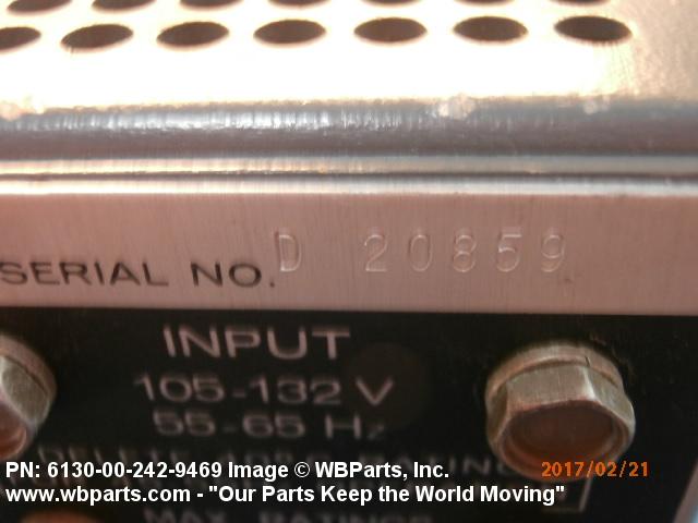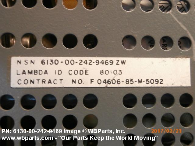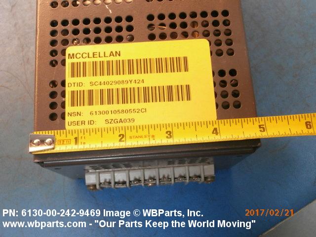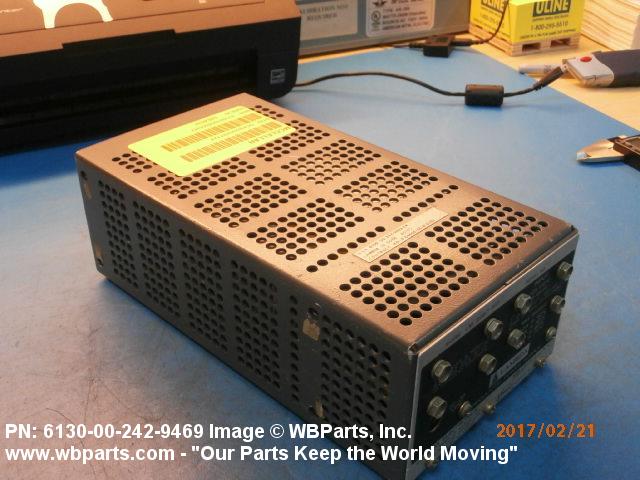 6130-00-242-9469 A component which converts available alternating current or direct current electrical power into a form required to operate another component or set. The item may consist of a combination of an INVERTOR, VIBRATOR; VIBRATOR, INTERRUPTER; VIBRATOR, SELF-RECTIFYING; INVERTOR, POWER, STATIC; with a transformer and rectifier(s) employing electron tubes, semiconductor diode or metallic (dry disc) type components, or the synchronized secondary contact(s) of a VIBRATOR, SELF-RECTIFYING; or may consist of electron tubes, semiconductor diode or metallic (dry disc) type rectifiers and capacitors in transformerless (alternating current-direct current type) circuits which may be of the voltage-multiplier type. The item may incorporate a FILTER, DIRECT CURRENT POWER and provisions for regulation of input and/or output voltage. The item may have special input, output, control or other facilities for applications in specialized environments such as medical, dental or other operations. Excludes battery chargers and rotating machinery types of items, such as motor generators and dynamotors.20461200044Transformers: Distribution and Power Station61300035Converters, Electrical, Nonrotating65150057Medical and Surgical Instruments, Equipment, and Supplies65200043Dental Instruments, Equipment, and Supplies