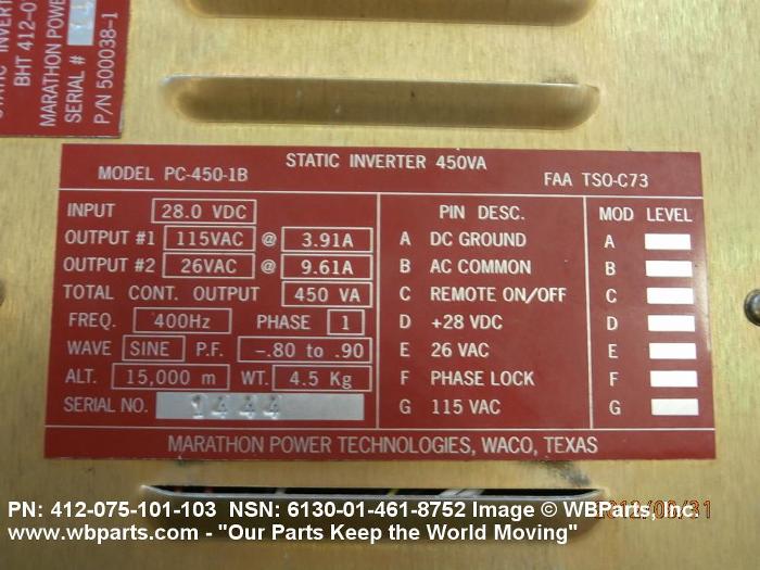 | III PART NAME ASSIGNED BY CONTROLLING AGENCY | INVERTER, 450 VA |
