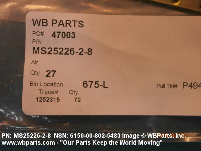 Part Alternates: MS2522628, MS25226-2-8 , 643428, 6434-2-8, 8800MS2522628, 8800MS25226-2-8, 6150-00-802-5483, 00-802-5483, 6150008025483, 008025483