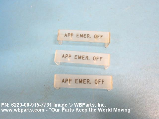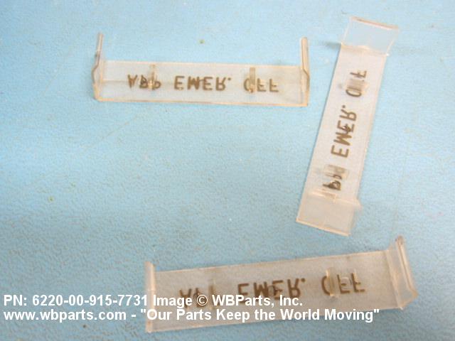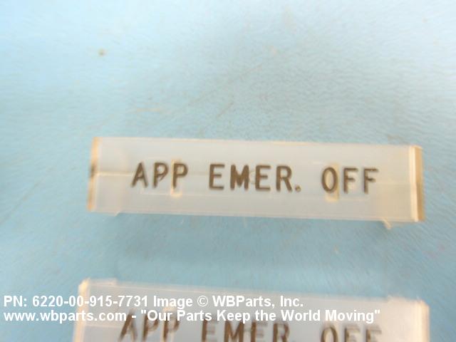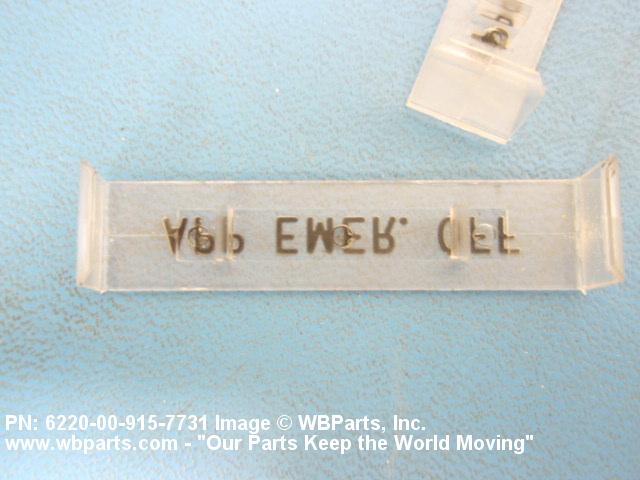 6220-00-915-7731 An item composed of a coated transparent or partly transparent/partly opaque materiels, engraved with letters, words and/or symbols, designed to allow light to be transmitted through the engraving(s) for indicating purposes. It may have an electrical lighting circuit either on a removable printed circuit board or embedded within the panel. The circuit may have removable or nonremovable electroluminescent and/or incandescent lamps for lighting. Dials and/or switches may be included. Excludes DISPLAY, OPTELECTRONIC. See also INDICATOR (as modified), and LIGHT (1), INDICATOR20262100045Indoor and Outdoor Electric Lighting Fixtures62200038Electric Vehicular Lights and Fixtures