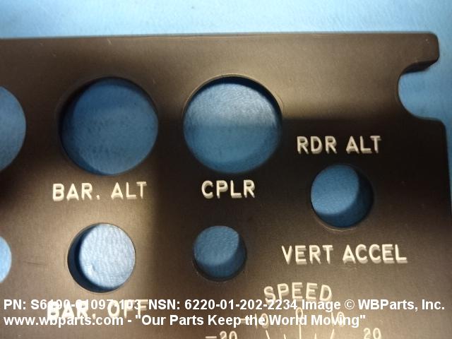 6220-01-202-2234 An item composed of a coated transparent or partly transparent/partly opaque materiels, engraved with letters, words and/or symbols, designed to allow light to be transmitted through the engraving(s) for indicating purposes. It may have an electrical lighting circuit either on a removable printed circuit board or embedded within the panel. The circuit may have removable or nonremovable electroluminescent and/or incandescent lamps for lighting. Dials and/or switches may be included. Excludes DISPLAY, OPTELECTRONIC. See also INDICATOR (as modified), and LIGHT (1), INDICATOR20262100045Indoor and Outdoor Electric Lighting Fixtures62200038Electric Vehicular Lights and Fixtures