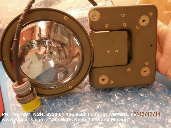 6230-01-105-6580 An item which conforms to Light (1), and is designed to project a concentrated, high intensity beam of light to locate or identify distant objects, and for long range illumination. May include such items as integral controls, lenses, color filters and signaling shutters. Includes items which can be adjusted to function as a FLOODLIGHT, ELECTRIC. See also SPOTLIGHT; FLOODLIGHT, ELECTRIC and LIGHT, SIGNAL.20362200038Electric Vehicular Lights and Fixtures62300045Electric Portable and Hand Lighting Equipment62600031Nonelectrical Lighting Fixtures
