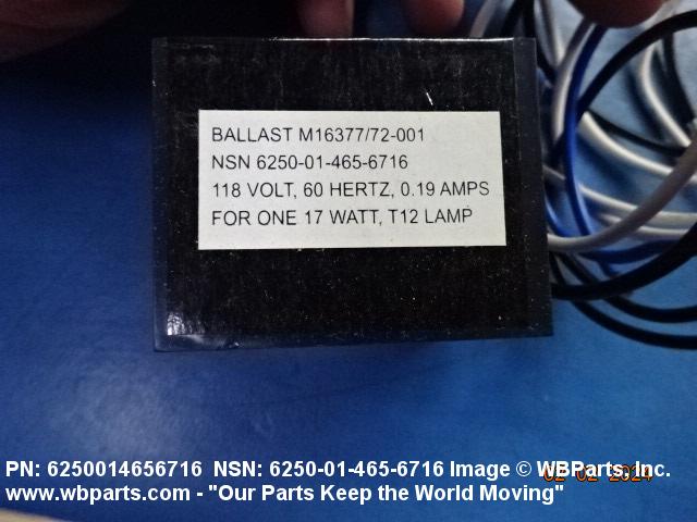 6250-01-465-6716 An item specifically designed for use with fluorescent or mercury vapor lamps and starters to provide a high starting voltage for striking the arc and to stabilize the operating impedance of the circuit in order to maintain the operating current at a steady value.