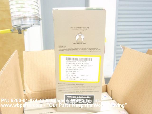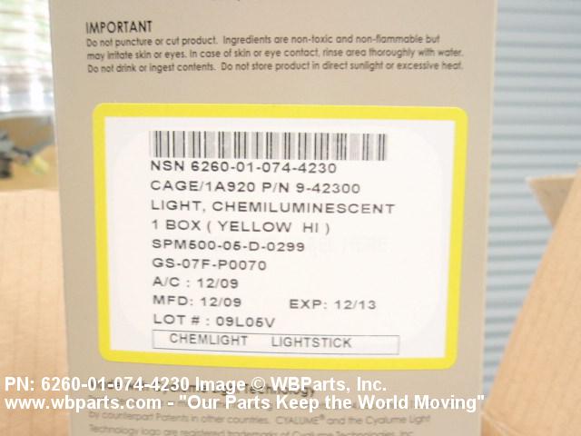 6260-01-074-4230 An item which produces illumination by a reaction between non-toxic, non-caustic chemical solutions. The emitted brightness is a liquid (cold) light (without heat, flame or spark). It is activated by bending the encapsulating material to break seperation. The item is windproof, waterproof and explosion proof. Excludes MARKER, SELF-LUMINOUS.