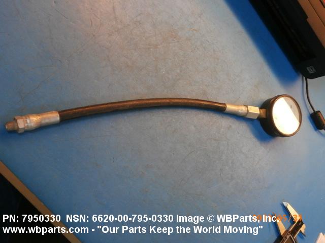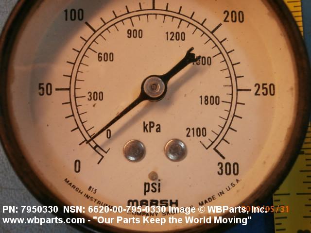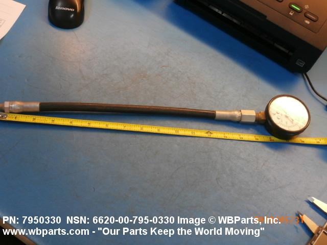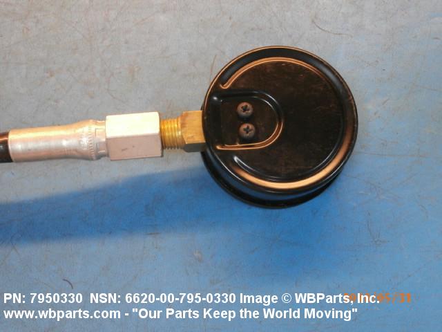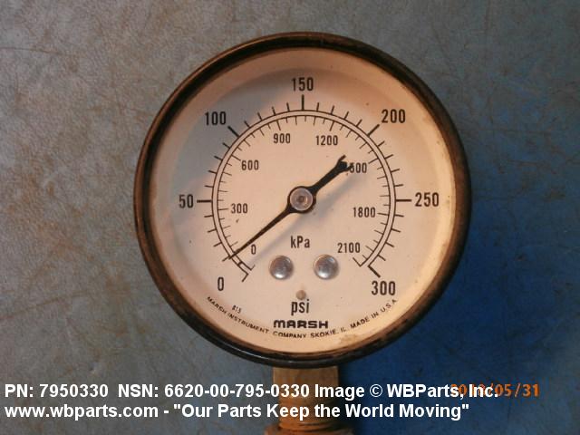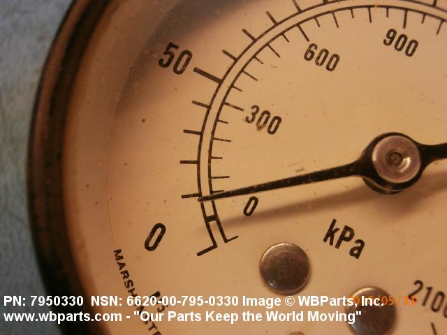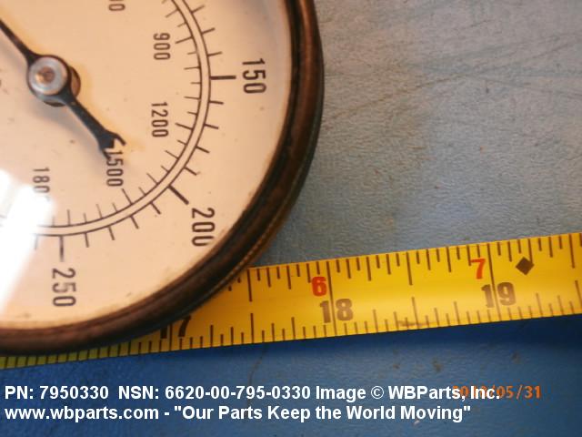 6620-00-795-0330 An instrument designed to measure air, gas, fluid, and vapor pressure by means of an internal pressure sensitive element (bellows, bourdon tube, transducer/transmitter and the like) which transmits energy, by direct linkage, to the indicating pointer of a scale or a digital display, calibrated in units of pressure. It may include a temperature equivalent scale. For items that do not have an internal pressure sensitive element see INDICATOR, PRESSURE.205138600004220000042400027Safety and Rescue Equipment66200018Engine Instruments66850073Pressure, Temperature, and Humidity Measuring and Controlling Instruments