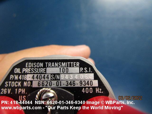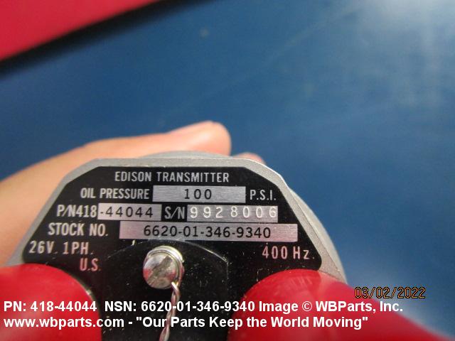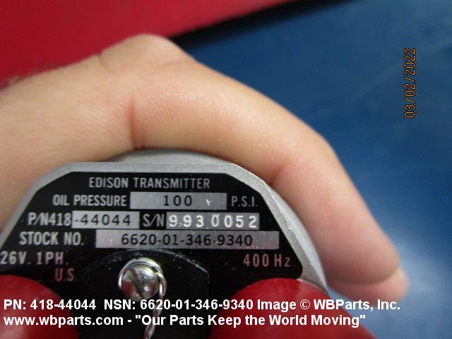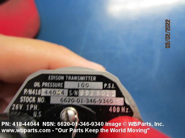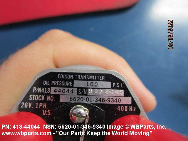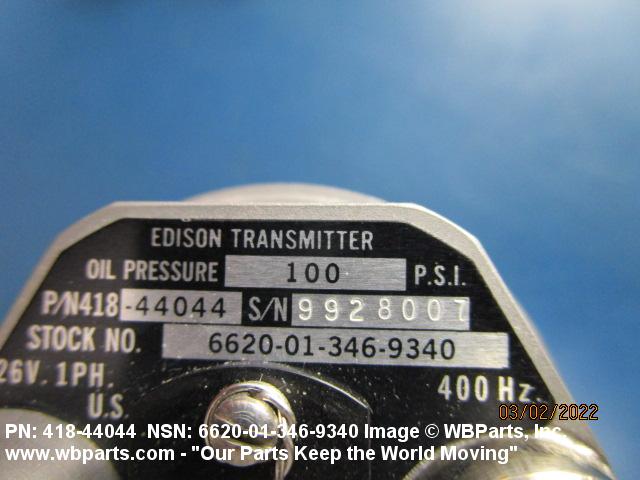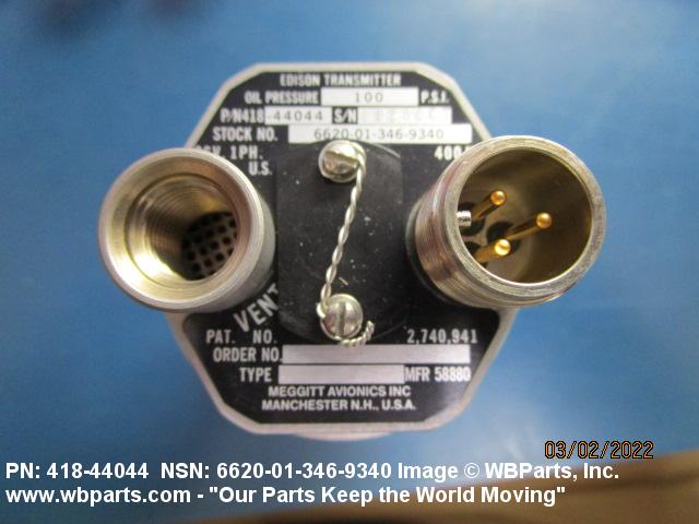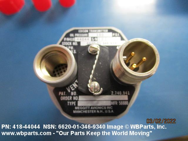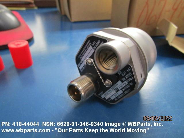 6620-01-346-9340 An instrument that senses, measures and converts pressure of a gas or fluid into electrical signals to be displayed in Pounds per Square Inch (PSI) or the equivalent. The item contains an input pressure port, electrical output connection and may include an output pressure port. See also TRANSDUCER, MOTIONAL PICKUP for items with a linear motional input and electrical output to be displayed in other than PSI or the equivalent.20266200018Engine Instruments66850073Pressure, Temperature, and Humidity Measuring and Controlling Instruments