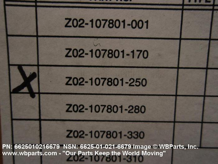 Part Alternates: Z02107801250, Z02-107801-250, 6625-01-021-6679, 01-021-6679, 6625010216679, 010216679