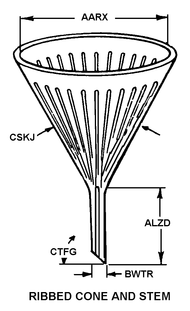6640-00-781-1647 A device consisting of a cone shaped reservoir with an outlet stem, having a length not greater than five (5) times the diameter of the cone top. It is fabricated of material, and is of a design and size, suitable for laboratory procedures. See also FUNNEL, FILTERING, LABORATORY and FUNNEL TUBE.