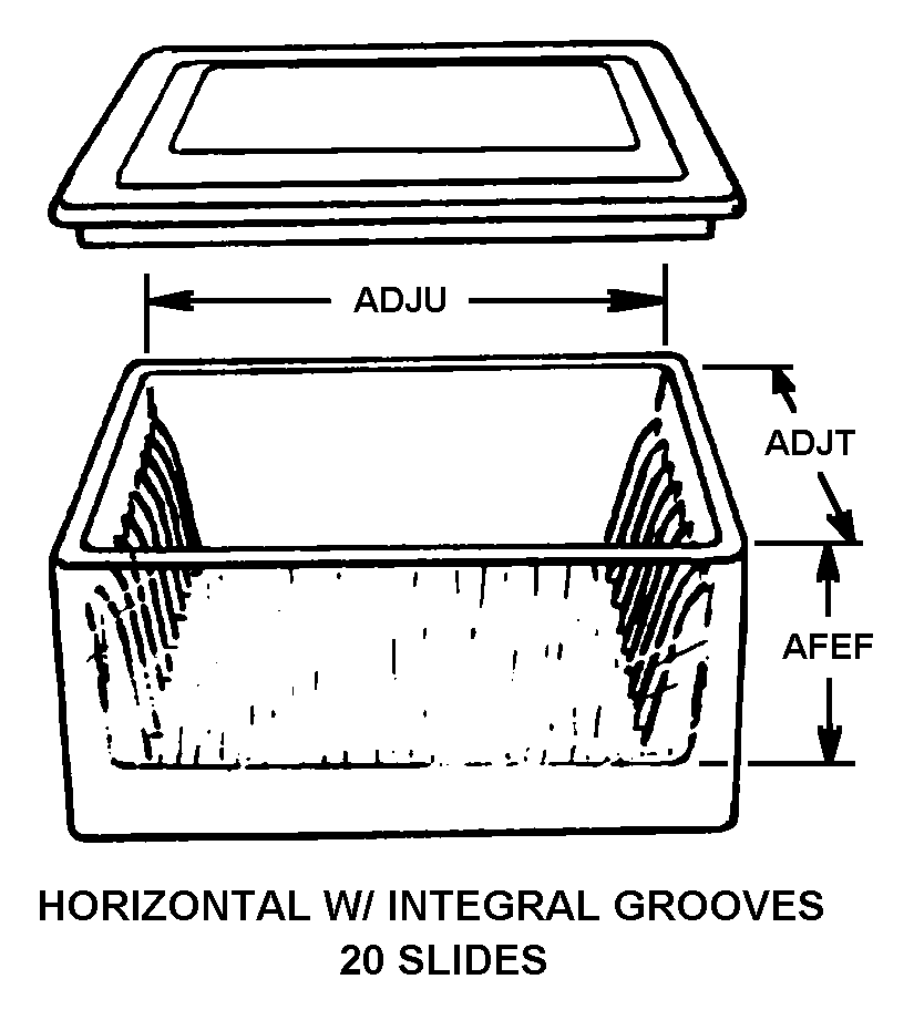 6640-01-352-0051 A vessel designed for use in staining microscopic slides. It may have integral grooves on inner sides, or a removable tray with grooves for holding slides in a vertical position. It is furnished with a cover.