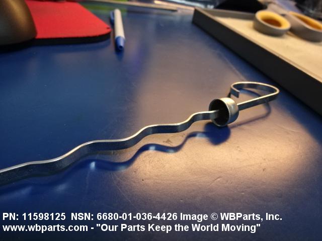 6680-00-814-1711 A thin metal strip, of various cross-sectional shapes, having graduations on one end and a handle on the opposite end. It is designed to be inserted into an engine, pump, or compressor crankcase, transmission, gearcase, fuel tank, or the like, to determine the level of the liquid. For a gage rod with an integral cap, or breather, see GAGE ROD-CAP, LIQUID LEVEL, and GAGE ROD-BREATHER, LIQUID LEVEL. For items designed to measure the liquid level of bulk petroleum tanks, see GAGE STICK, PETROLEUM.