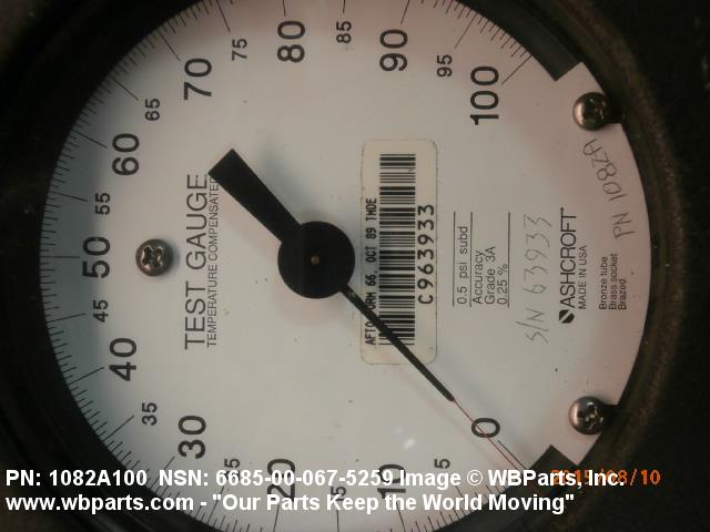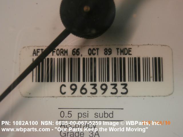 6685-00-067-5259 An instrument designed to measure air, gas, fluid, and vapor pressure by means of an internal pressure sensitive element (bellows, bourdon tube, transducer/transmitter and the like) which transmits energy, by direct linkage, to the indicating pointer of a scale or a digital display, calibrated in units of pressure. It may include a temperature equivalent scale. For items that do not have an internal pressure sensitive element see INDICATOR, PRESSURE.205138600004220000042400027Safety and Rescue Equipment66200018Engine Instruments66850073Pressure, Temperature, and Humidity Measuring and Controlling Instruments