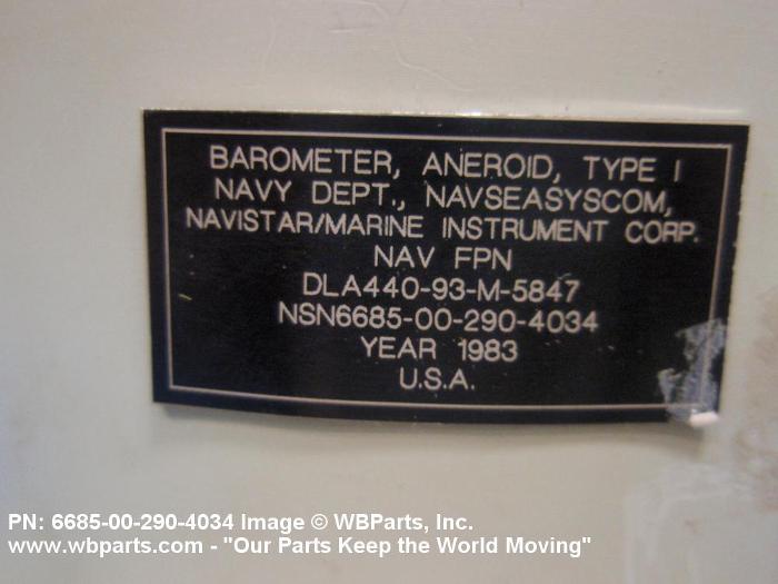6685-00-290-4034 A barometer consisting of a pressure-sensitive element which contracts or expands in proportion to atmospheric pressure, connected through a linkage to a pointer. Its dial is graduated in units of pressure measurement (pounds per square inch, inches of mercury, millibars, etc.) to indicate atmospheric pressure only.20266600040Meteorological Instruments and Apparatus66850073Pressure, Temperature, and Humidity Measuring and Controlling Instruments