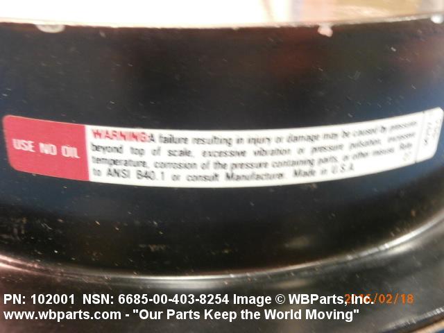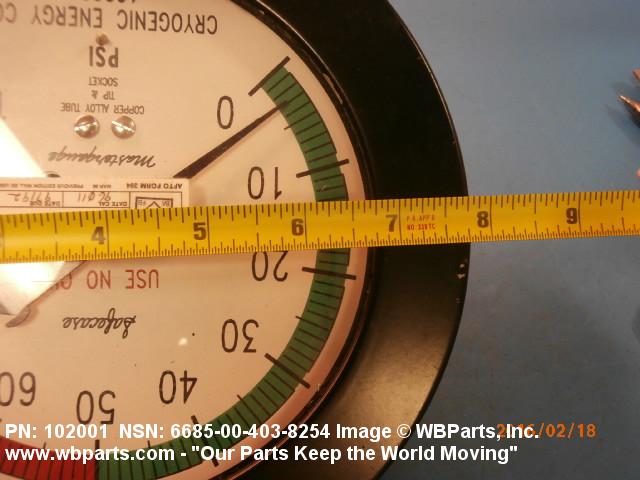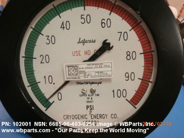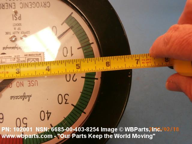 6685-00-403-8254 An instrument designed to measure air, gas, fluid, and vapor pressure by means of an internal pressure sensitive element (bellows, bourdon tube, transducer/transmitter and the like) which transmits energy, by direct linkage, to the indicating pointer of a scale or a digital display, calibrated in units of pressure. It may include a temperature equivalent scale. For items that do not have an internal pressure sensitive element see INDICATOR, PRESSURE.205138600004220000042400027Safety and Rescue Equipment66200018Engine Instruments66850073Pressure, Temperature, and Humidity Measuring and Controlling Instruments