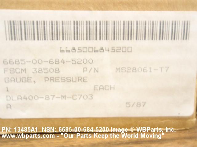 6685-00-684-5200 An instrument designed to measure air, gas, fluid, and vapor pressure by means of an internal pressure sensitive element (bellows, bourdon tube, transducer/transmitter and the like) which transmits energy, by direct linkage, to the indicating pointer of a scale or a digital display, calibrated in units of pressure. It may include a temperature equivalent scale. For items that do not have an internal pressure sensitive element see INDICATOR, PRESSURE.205138600004220000042400027Safety and Rescue Equipment66200018Engine Instruments66850073Pressure, Temperature, and Humidity Measuring and Controlling Instruments