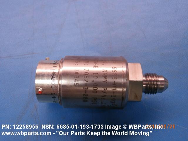 6685-01-193-1733 An instrument that senses, measures and converts pressure of a gas or fluid into electrical signals to be displayed in Pounds per Square Inch (PSI) or the equivalent. The item contains an input pressure port, electrical output connection and may include an output pressure port. See also TRANSDUCER, MOTIONAL PICKUP for items with a linear motional input and electrical output to be displayed in other than PSI or the equivalent.20266200018Engine Instruments66850073Pressure, Temperature, and Humidity Measuring and Controlling Instruments