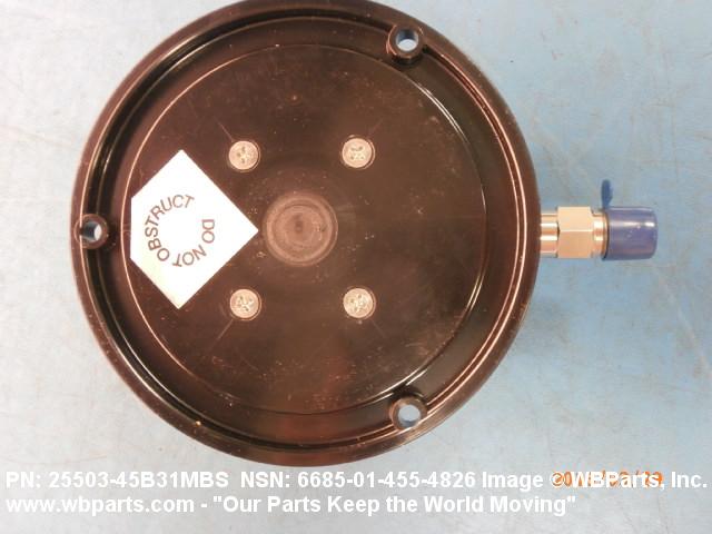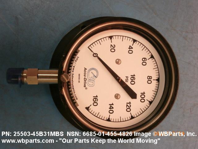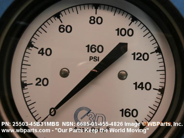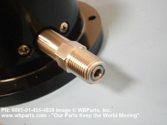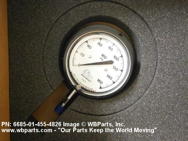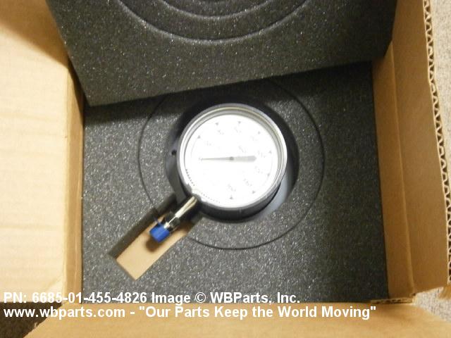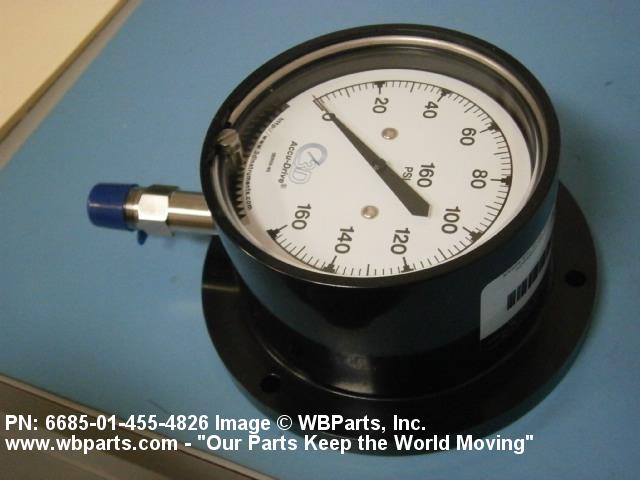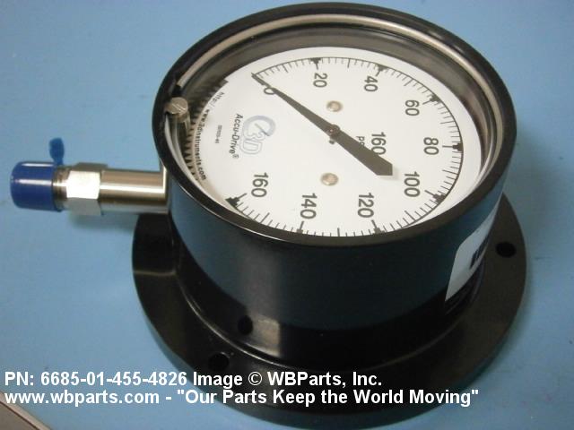 6685-01-455-4826 An instrument designed to measure air, gas, fluid, and vapor pressure by means of an internal pressure sensitive element (bellows, bourdon tube, transducer/transmitter and the like) which transmits energy, by direct linkage, to the indicating pointer of a scale or a digital display, calibrated in units of pressure. It may include a temperature equivalent scale. For items that do not have an internal pressure sensitive element see INDICATOR, PRESSURE.205138600004220000042400027Safety and Rescue Equipment66200018Engine Instruments66850073Pressure, Temperature, and Humidity Measuring and Controlling Instruments