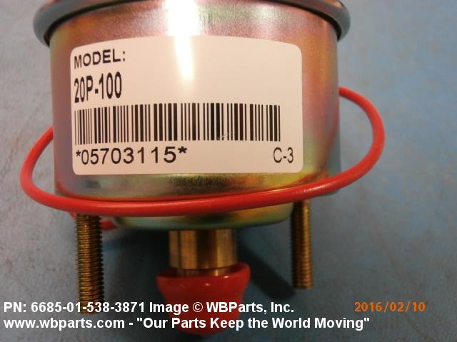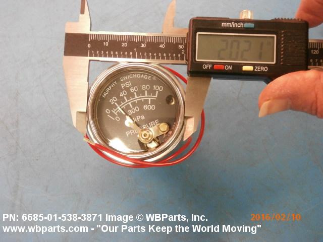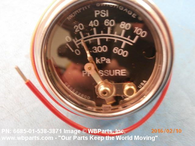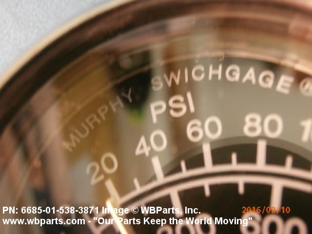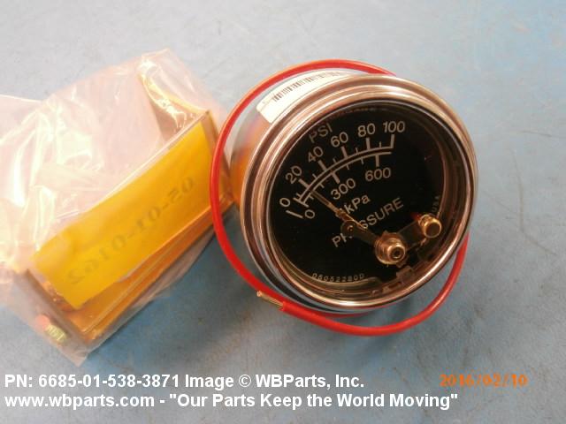 6685-01-538-3871 An instrument designed to measure air, gas, fluid, and vapor pressure by means of an internal pressure sensitive element (bellows, bourdon tube, transducer/transmitter and the like) which transmits energy, by direct linkage, to the indicating pointer of a scale or a digital display, calibrated in units of pressure. It may include a temperature equivalent scale. For items that do not have an internal pressure sensitive element see INDICATOR, PRESSURE.205138600004220000042400027Safety and Rescue Equipment66200018Engine Instruments66850073Pressure, Temperature, and Humidity Measuring and Controlling Instruments