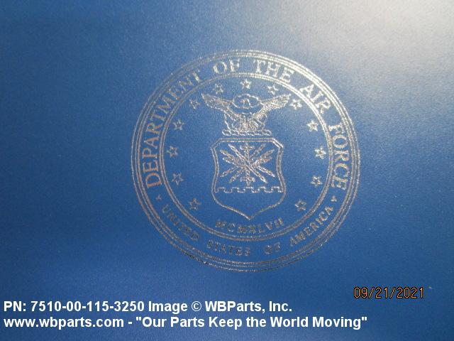 | GENERAL CHARACTERISTICS ITEM DESCRIPTION | PASTED CHIPBOARD,PADDED W/POLYURETHANE FOAM,BLUE VINYL O/A COVERING,RIBBED BACK,FOUR RIGHT ANGLED CORNER POCKETS INSIDE EACH COVER,8 1/2 X 11 IN. SHEET SIZE,TWO CLEAR PLASTIC PROTECTOR SHEETS,AIR FORCE SEAL DEBOSSED IN SILVER AND CENTER OF FRONT COVER |